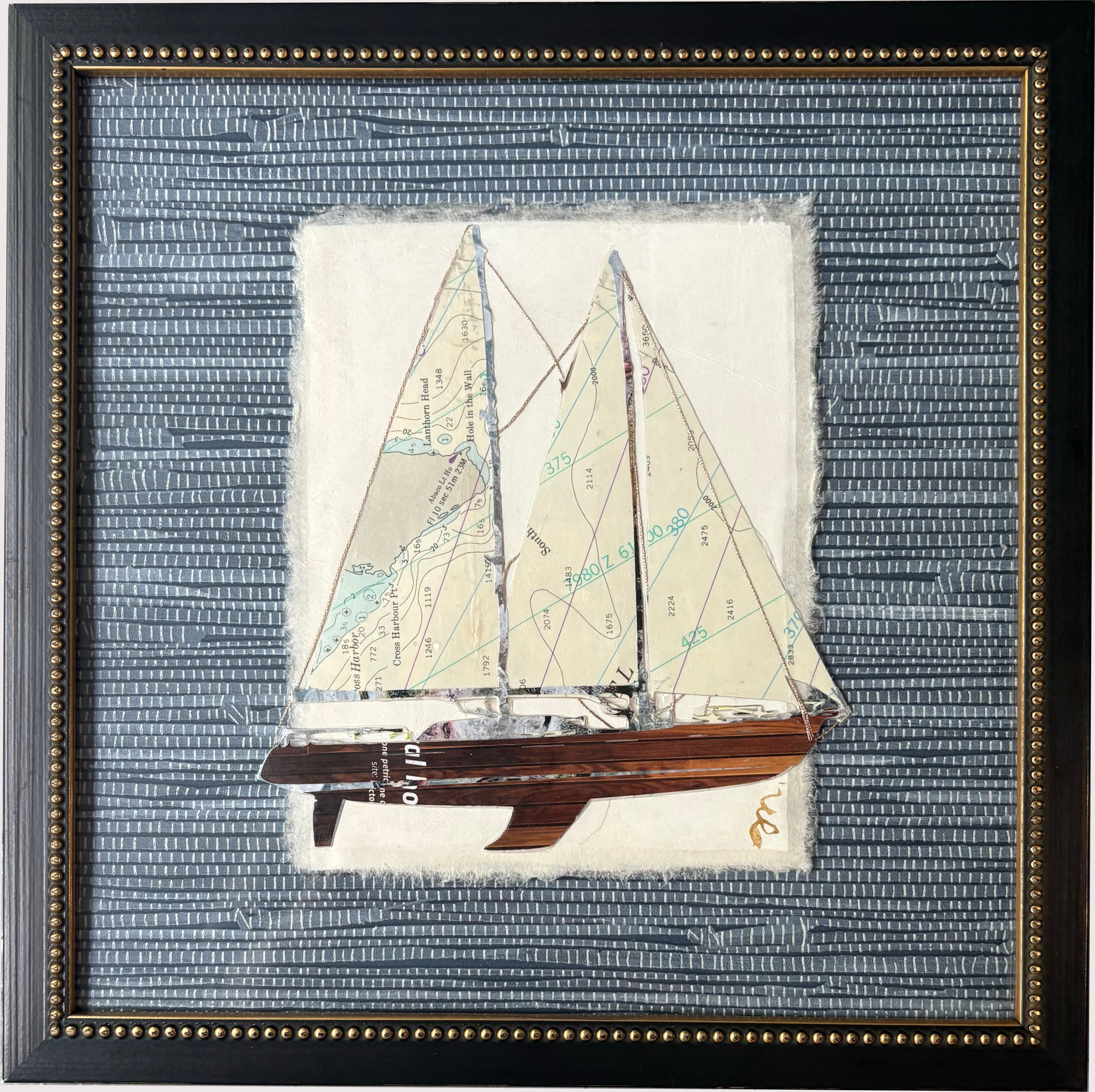 mixed media collage, framed in a black and gold wooden frame