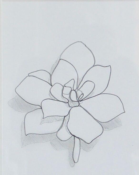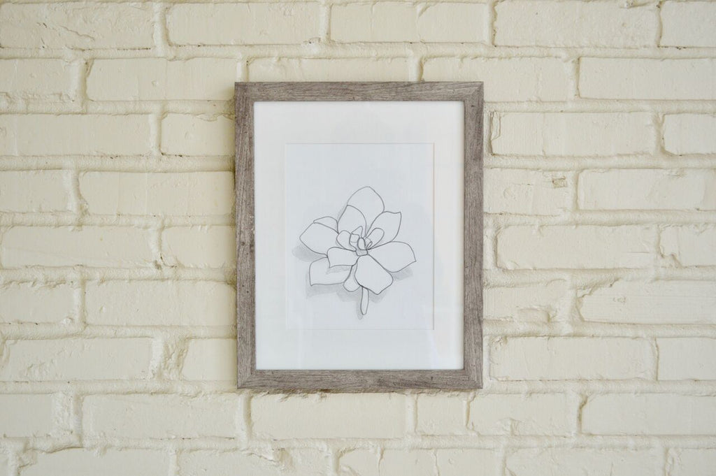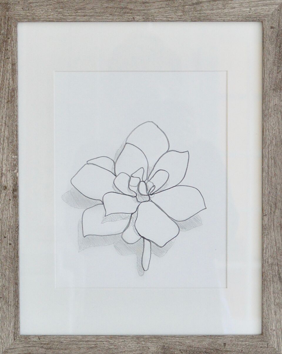 graphite on paper, framed in white mat with wooden frame