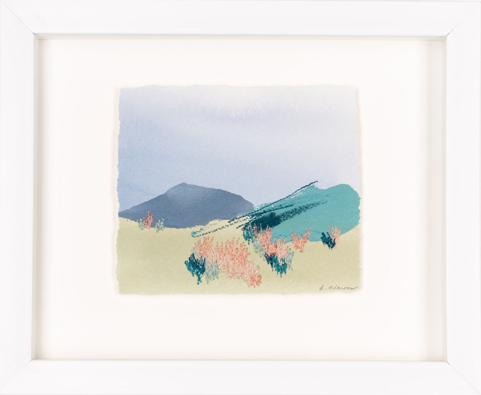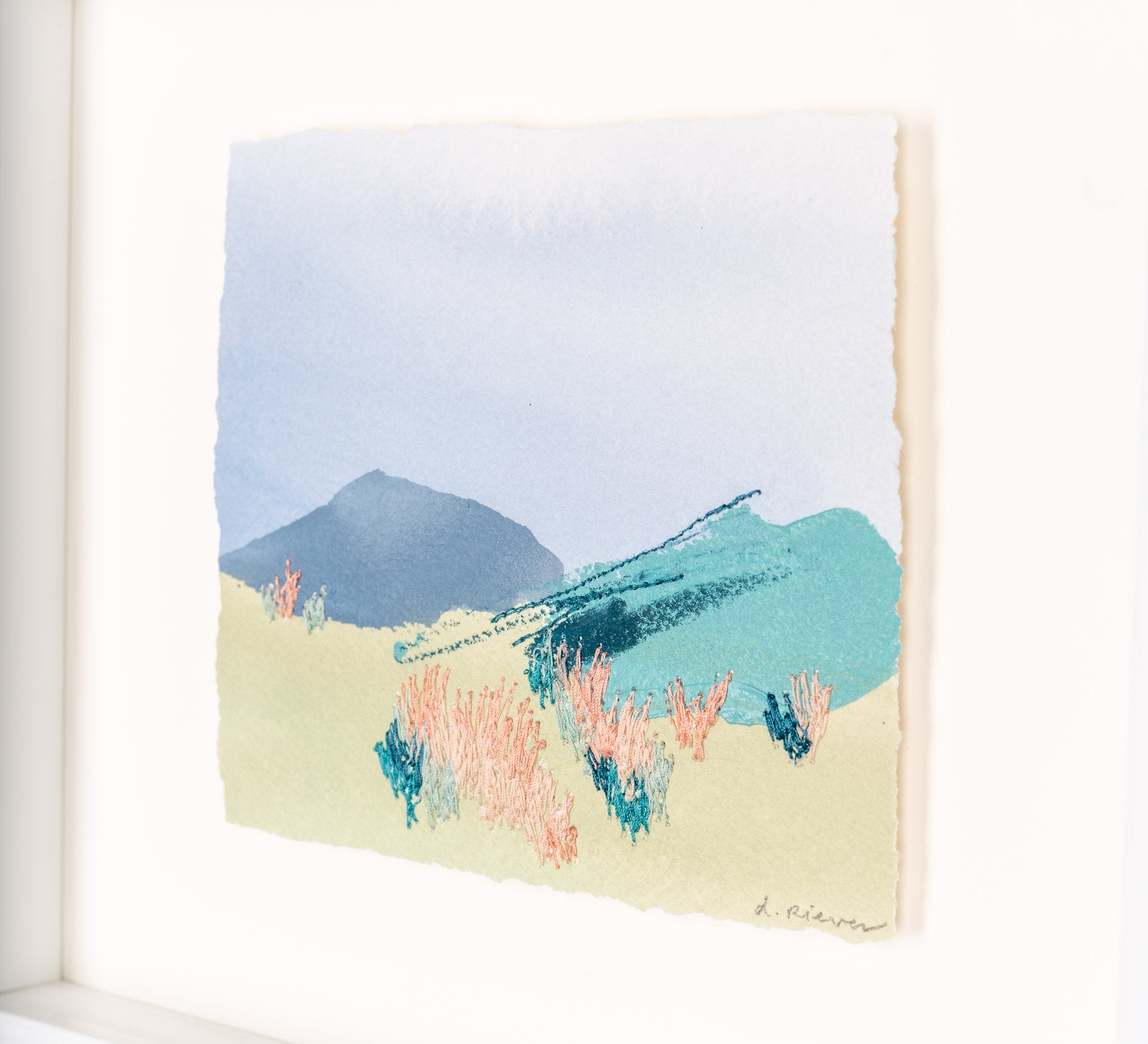 mixed media on paper, floating on white mat, in white shadowbox frame