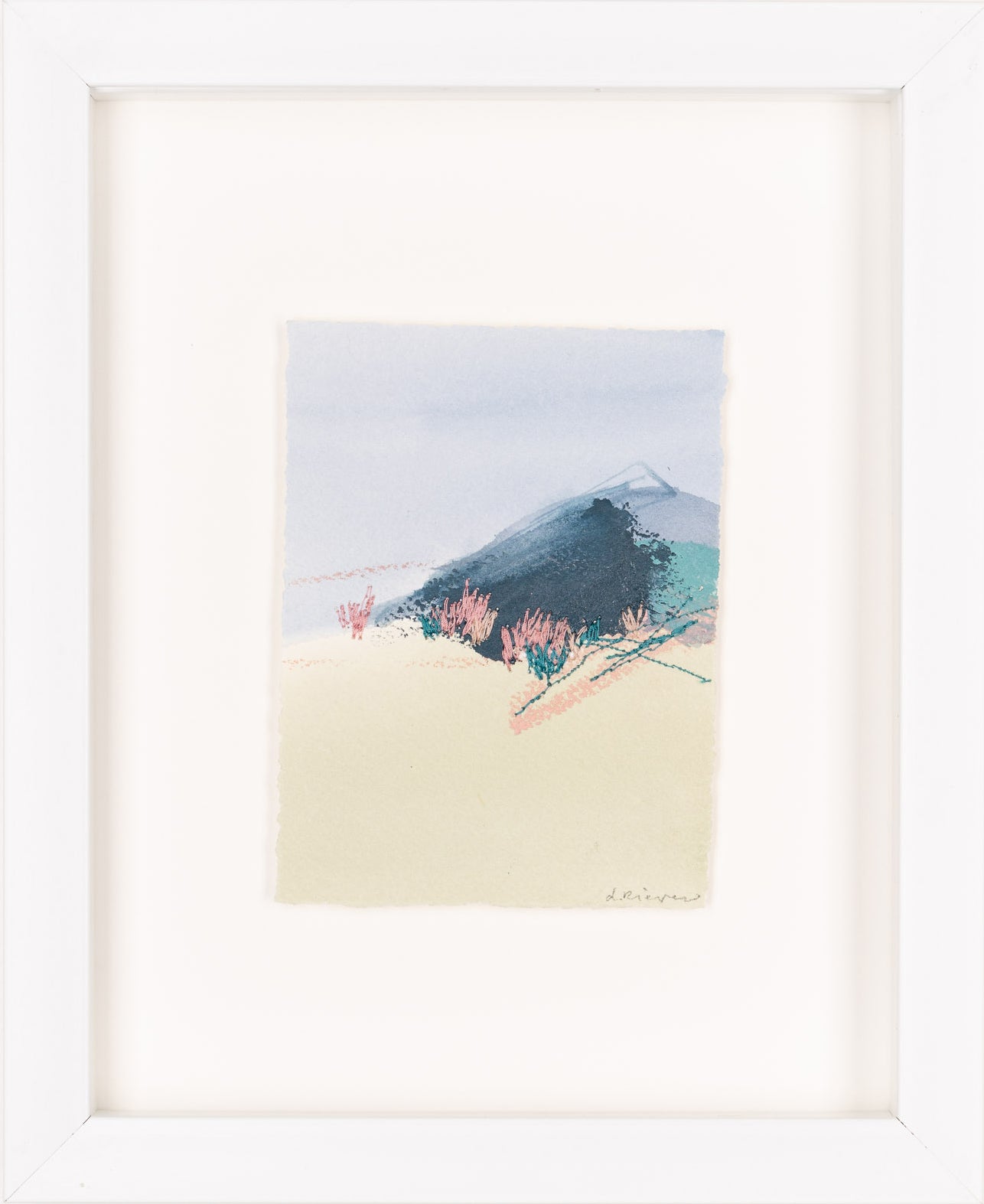 mixed media on paper, floating on white mat, in white shadowbox frame