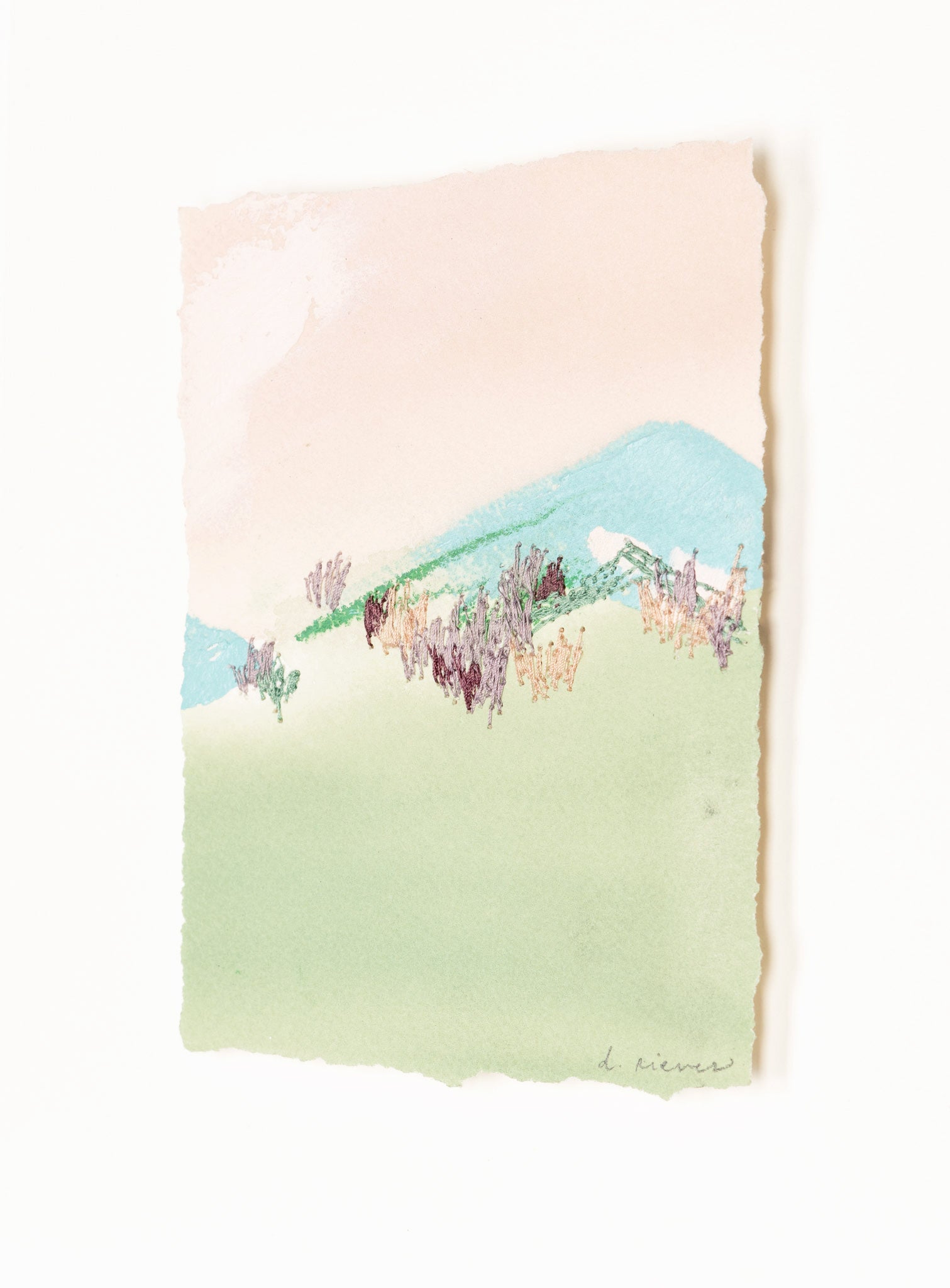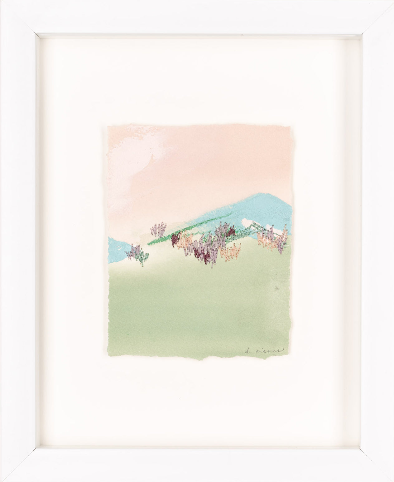 mixed media on paper, floating on white mat, in white shadowbox frame