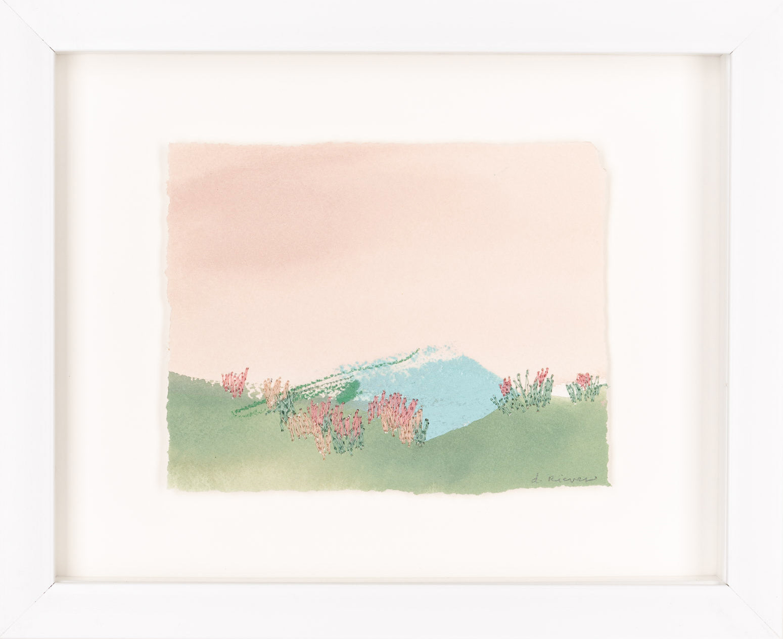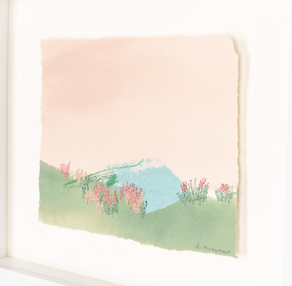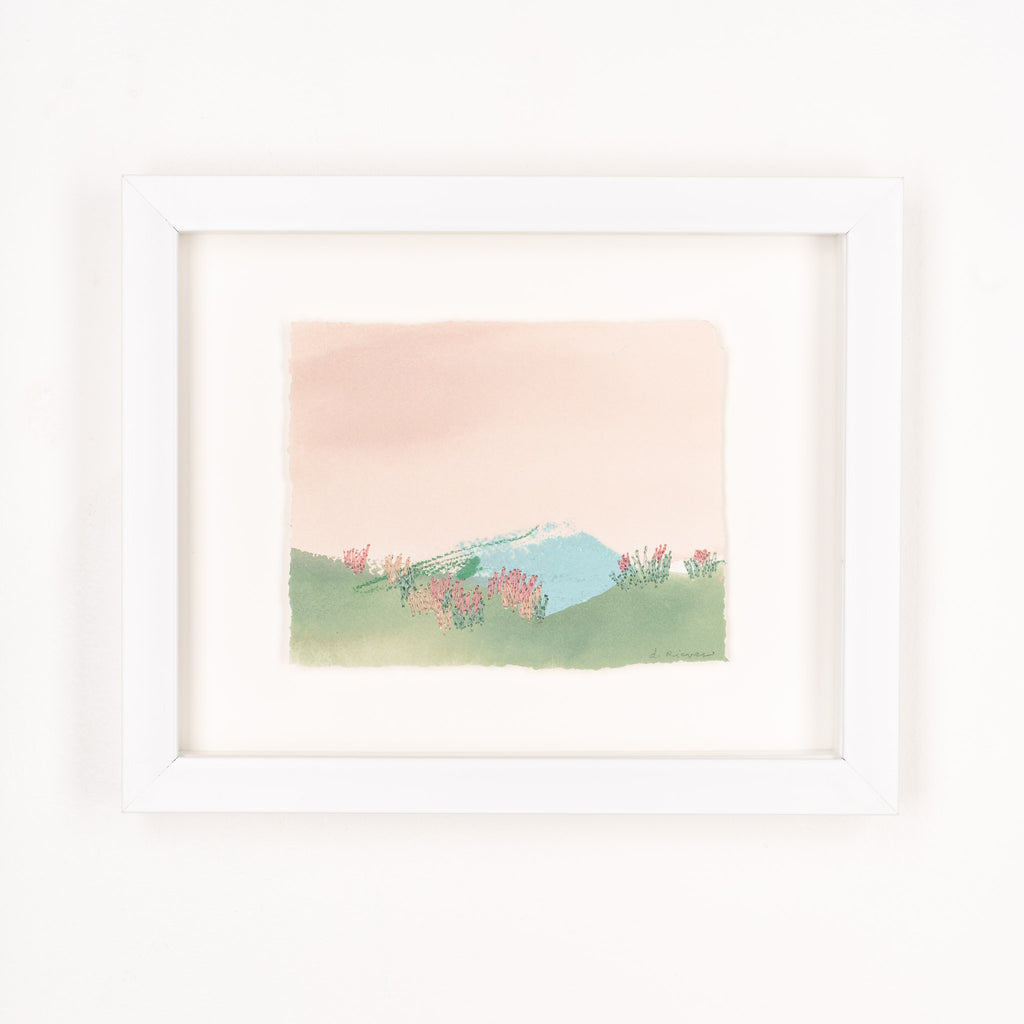 mixed media on paper, floating on white mat, in white shadowbox frame