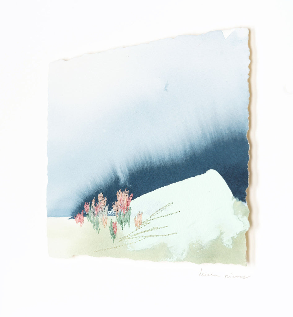mixed media on paper, floating on white mat, in white shadowbox frame