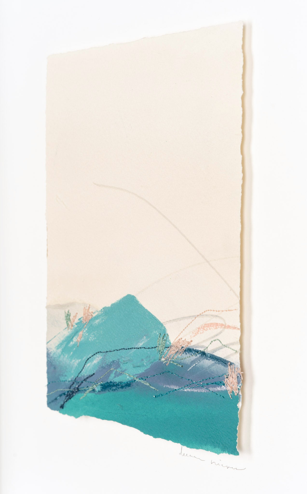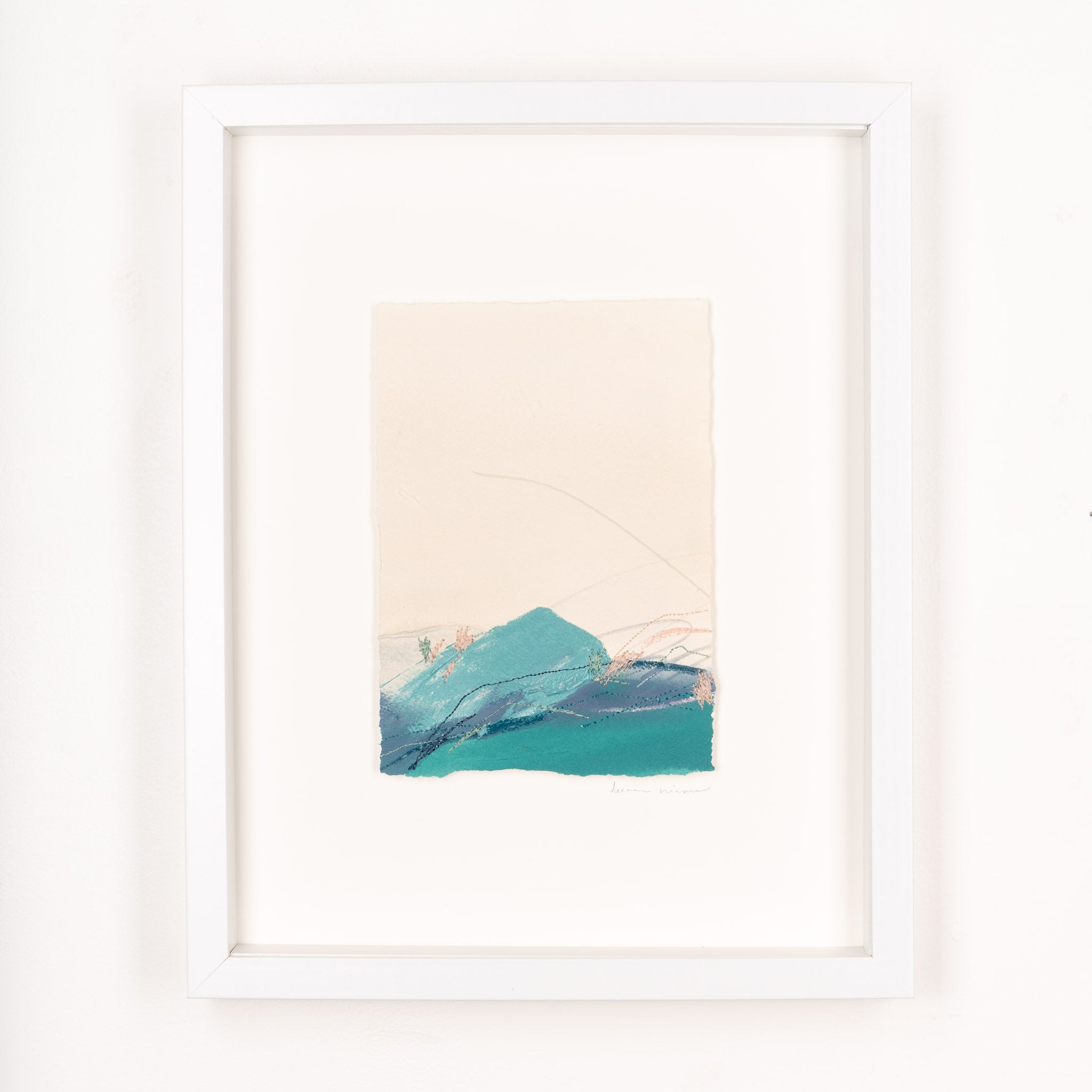 mixed media on paper, floating on white mat, in white shadowbox frame