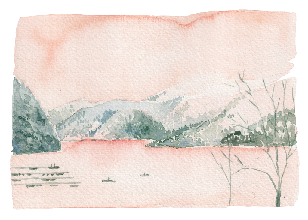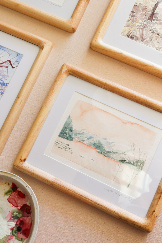 watercolor on paper, in white mat and natural wood frame with rounded corners