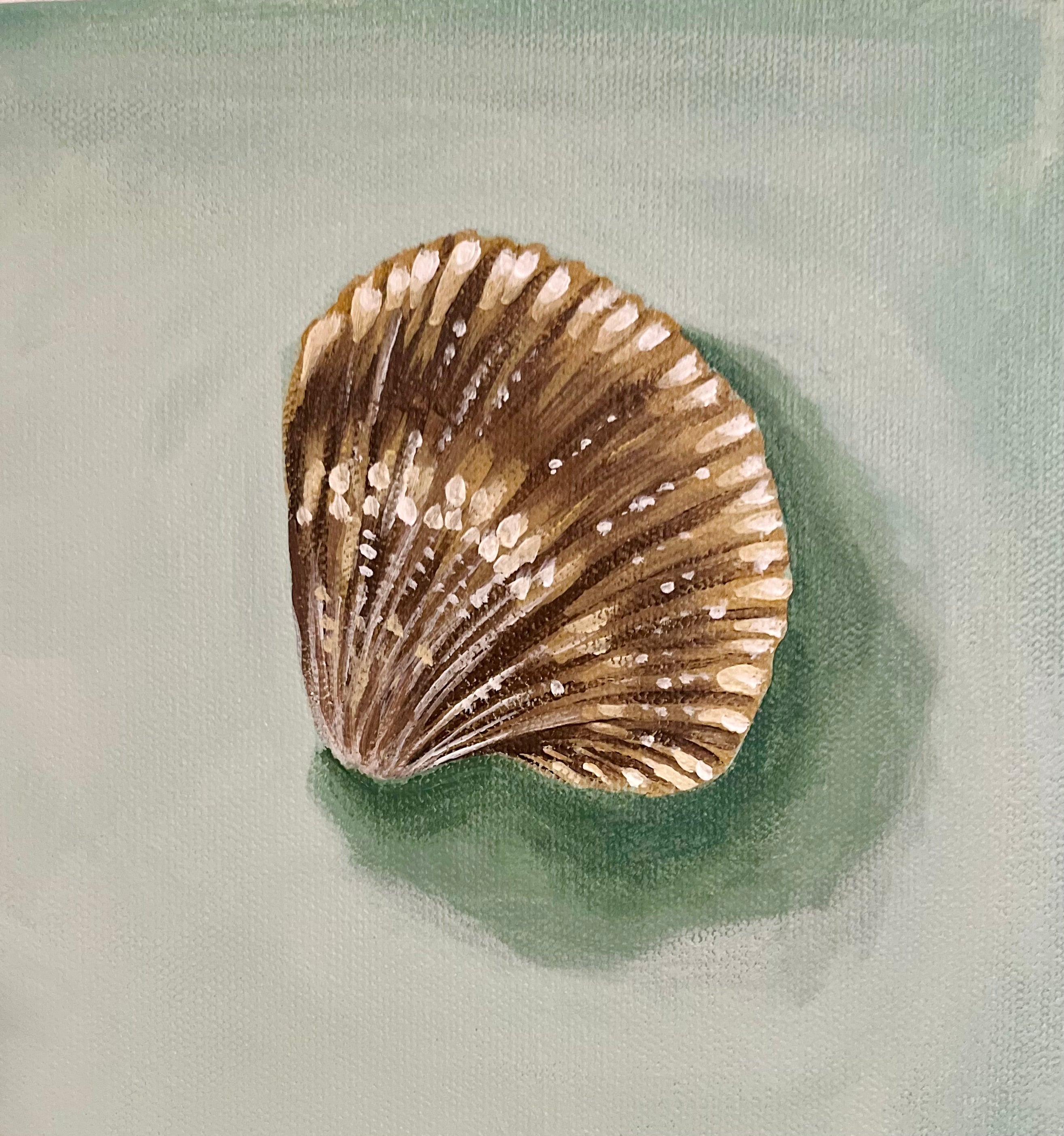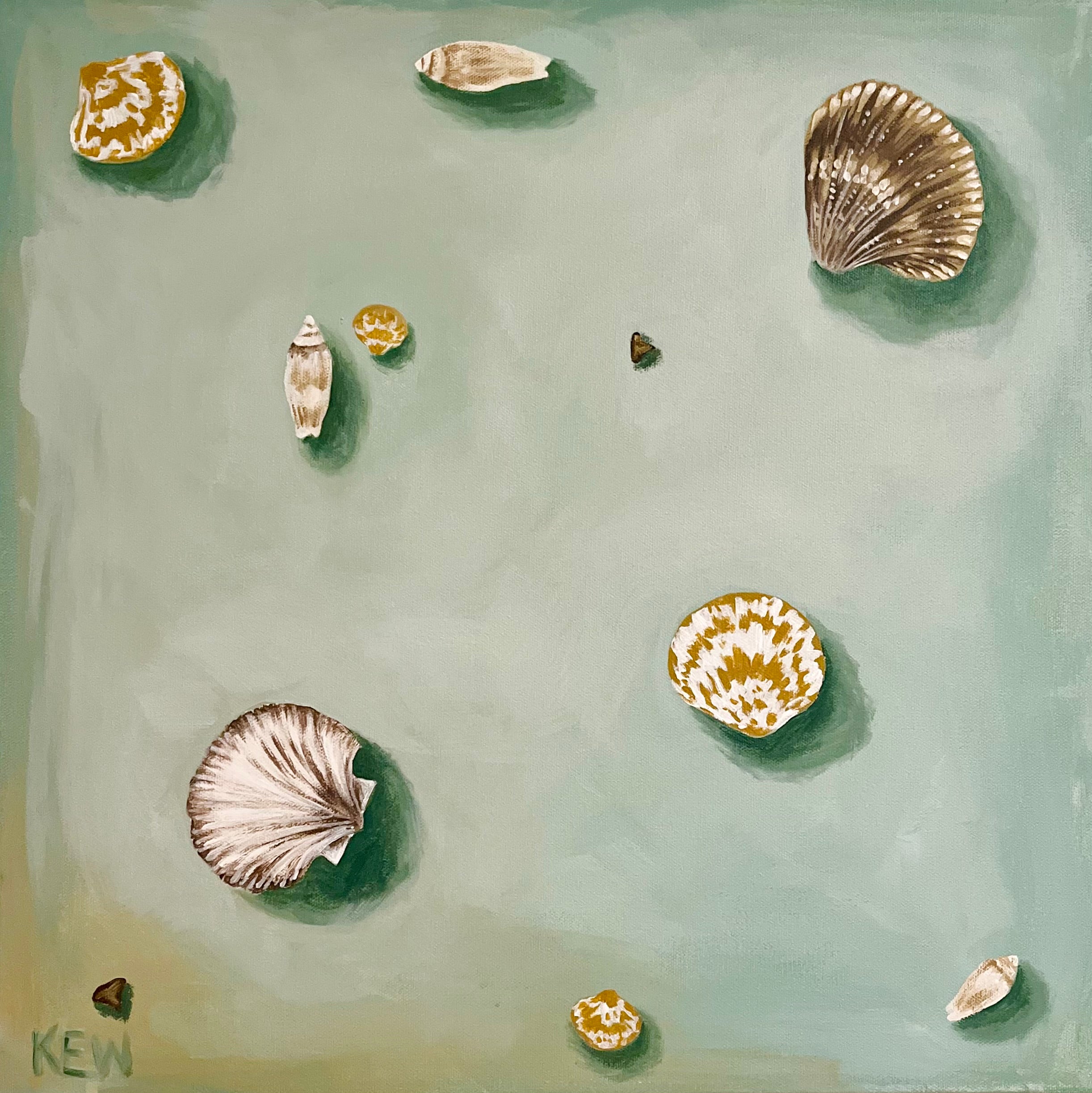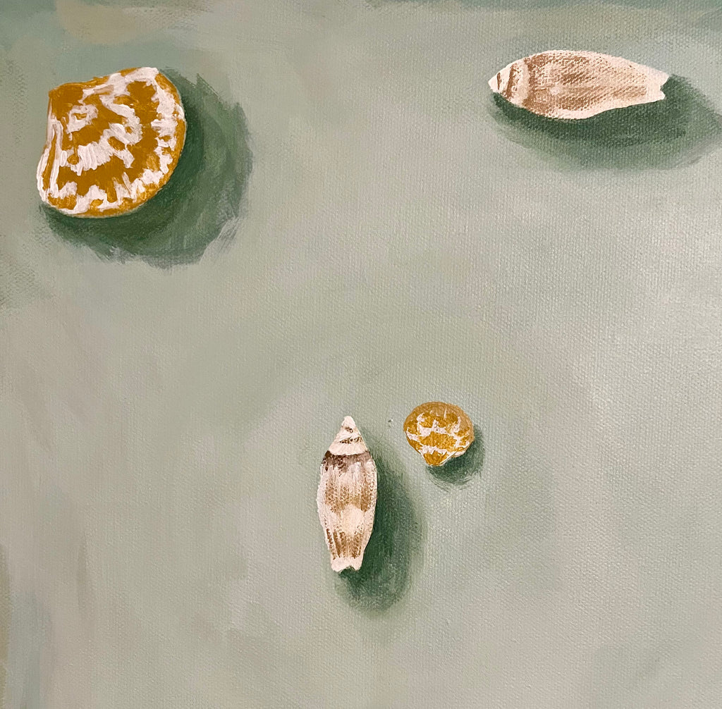 Pensacola based artist, Kelly Whibbs, finds her inspiration right at home on the Gulf Coast. The vibrant beauty and serene energy of her coastal town is infused into her work through layers of color and texture. Most of Kelly’s works are acrylic on canvas and feature organic forms one might find near the sea. She is probably most well known for her paintings of palms, which are featured in many of her collectors’ homes and businesses. Her most recent works are influenced by her seashell collection from a lifetime of beachcombing on Pensacola Beach and Maryland’s Eastern Shore. Kelly enjoys experimenting with scale and light, inviting the viewer to step forward and take a closer look. When she is not painting, Kelly can be found spending time with her husband, their three little boys, and their dog, Chessy. They are on the water whenever possible- whether boating, catching crabs, fishing, or just having themselves a beach day.