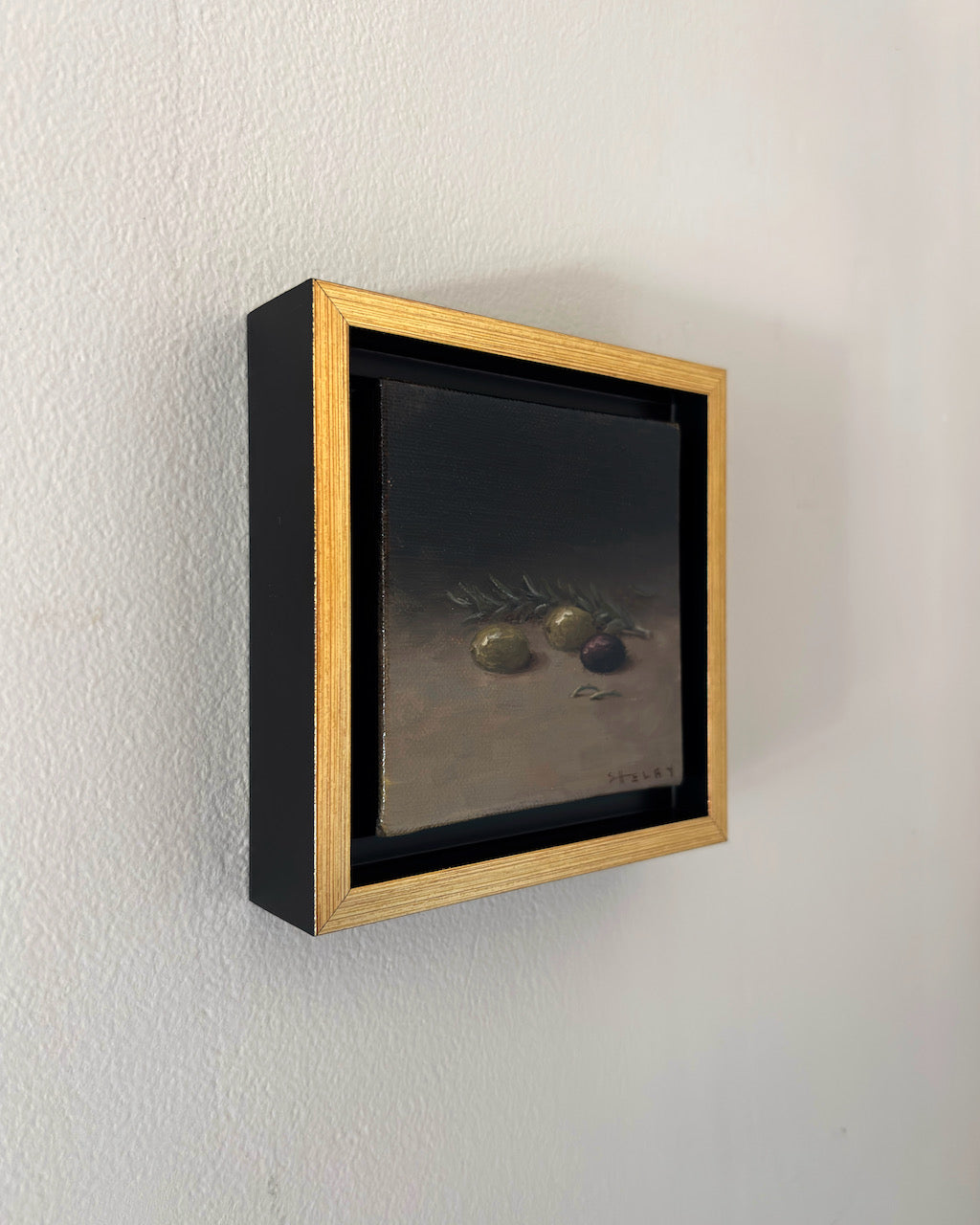 oil on linen panel, in black and gold floater frame