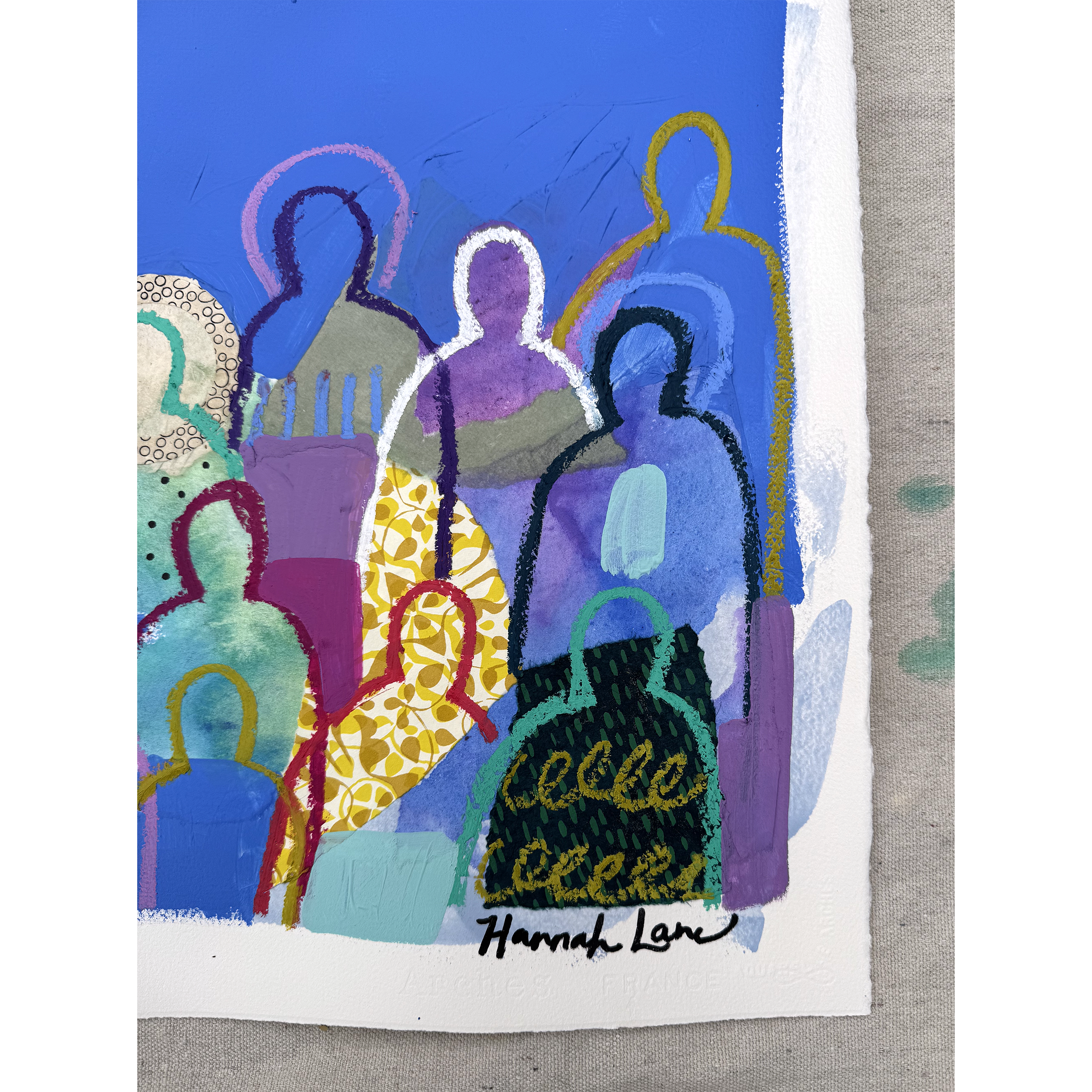Hannah Lane is a contemporary mixed media artist celebrated for her bold use of color and dynamic, collage-like layering. A Louisiana native and graduate of the Savannah College of Art & Design, Hannah draws deep inspiration from the vibrant landscapes, diverse cultures, and heartfelt sense of family and community found in her southern roots. Her work blends pigmented Japanese papers, expressive line work, and rich washes of acrylic paint to create textured, energetic paintings. Each collection reflects her love for nature, storytelling, and community—an invitation to explore the beauty of her inner imagination. Hannah is represented by some of the top galleries in the Southeast, and her paintings are collected privately and in corporate spaces across the country. She also loves working one-on-one with collectors to create meaningful, custom pieces. After living and painting in Italy and New Orleans, Hannah now calls Nashville home, where she is part of a thriving art community. When she’s not painting in her home studio, you’ll find Hannah hiking with her boys, reading, or cooking up something seasonal and delicious! The crowd series is one of my most iconic collections, inspired by my big, beautiful Louisiana family and the joyful spirit of southern gatherings. I grew up surrounded by cousins, friends, and neighbors—many from families as large and lively as my own—where faith and family were at the heart of everything. Over the past 12 years, this series has evolved with new patterns, papers, and symbols that reflect the changing seasons of life. Each crowd painting is a kind of meditation, a reflection on the deep truth that we’re all connected. Rich with personal symbols and intuitive mark-making, these pieces push the boundaries of mixed media and invite you to see something familiar in a new way. Whether you're drawn to the vibrant energy, the quiet details, or the sense of belonging they evoke, each crowd carries its own unique aura—waiting for the right person to bring it home.