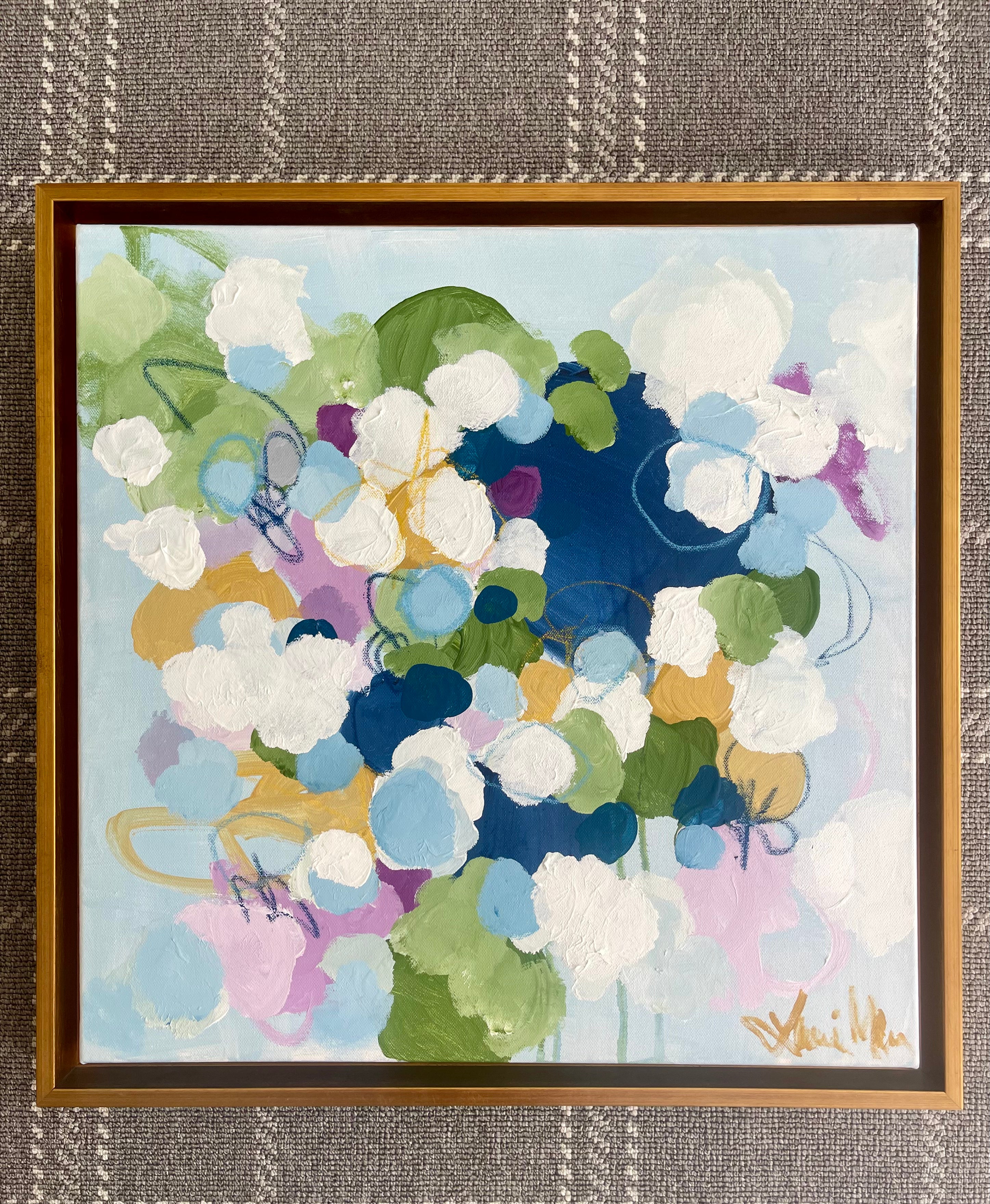 acrylic and oil pastel on gallery wrapped canvas, in gold floater frame