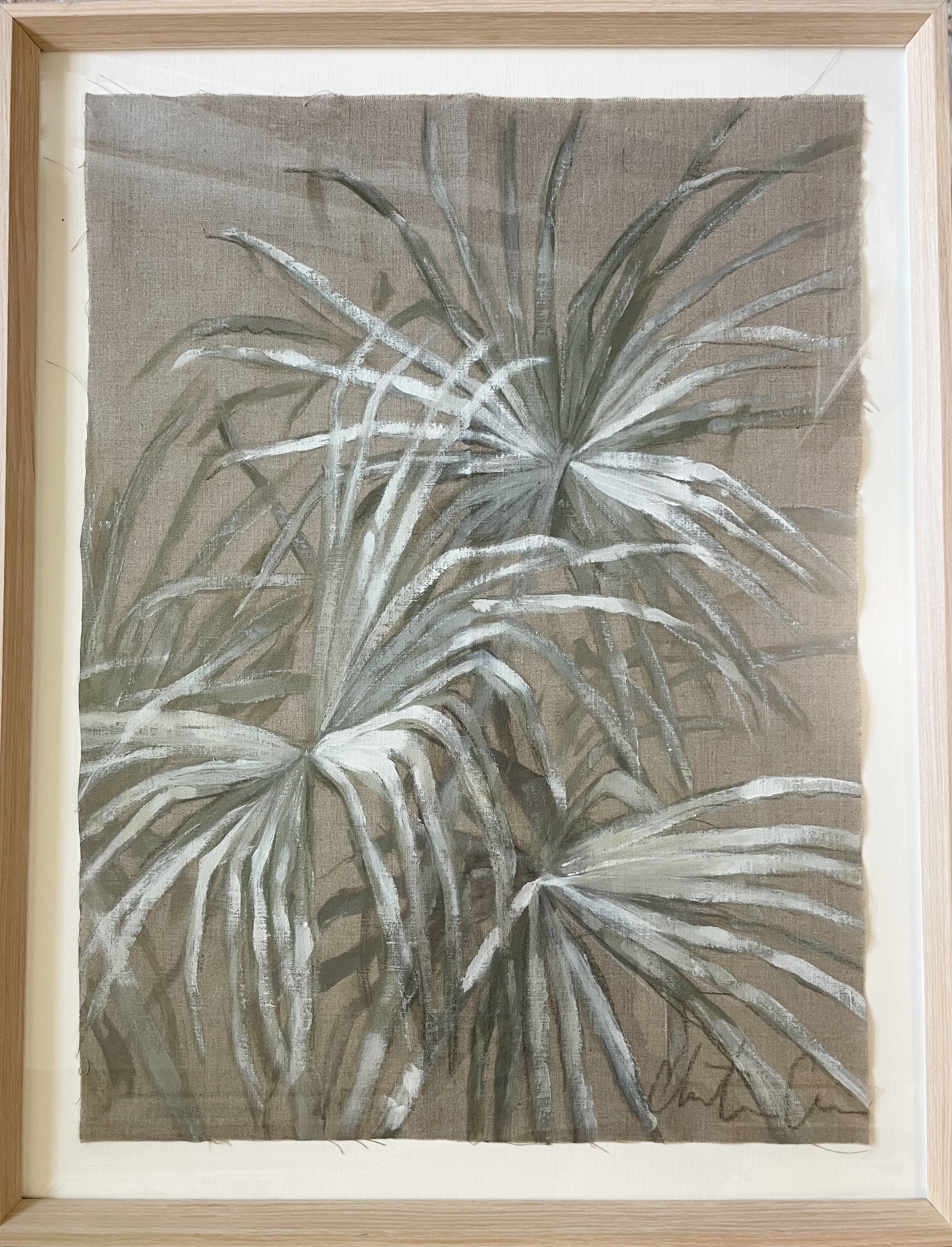 acrylic paint on raw linen canvas, mounted to board, framed in natural wood frame