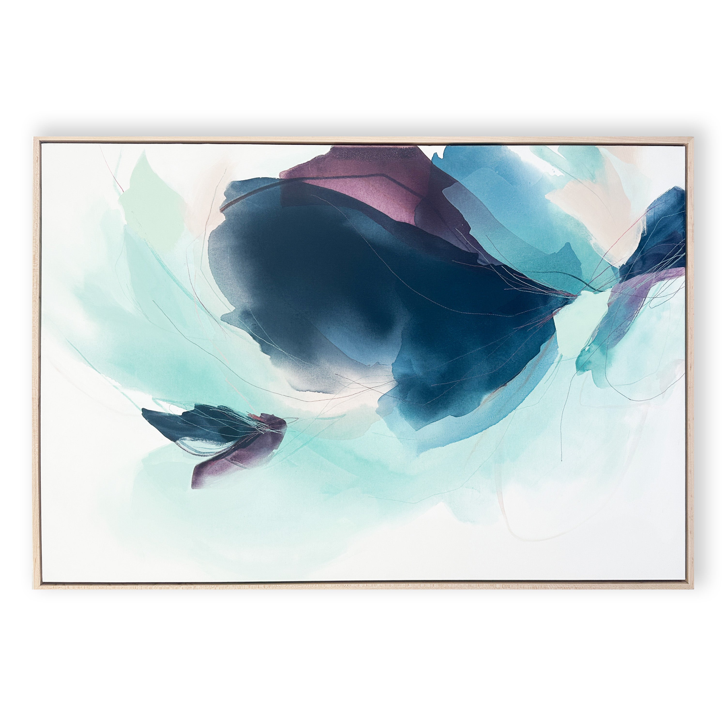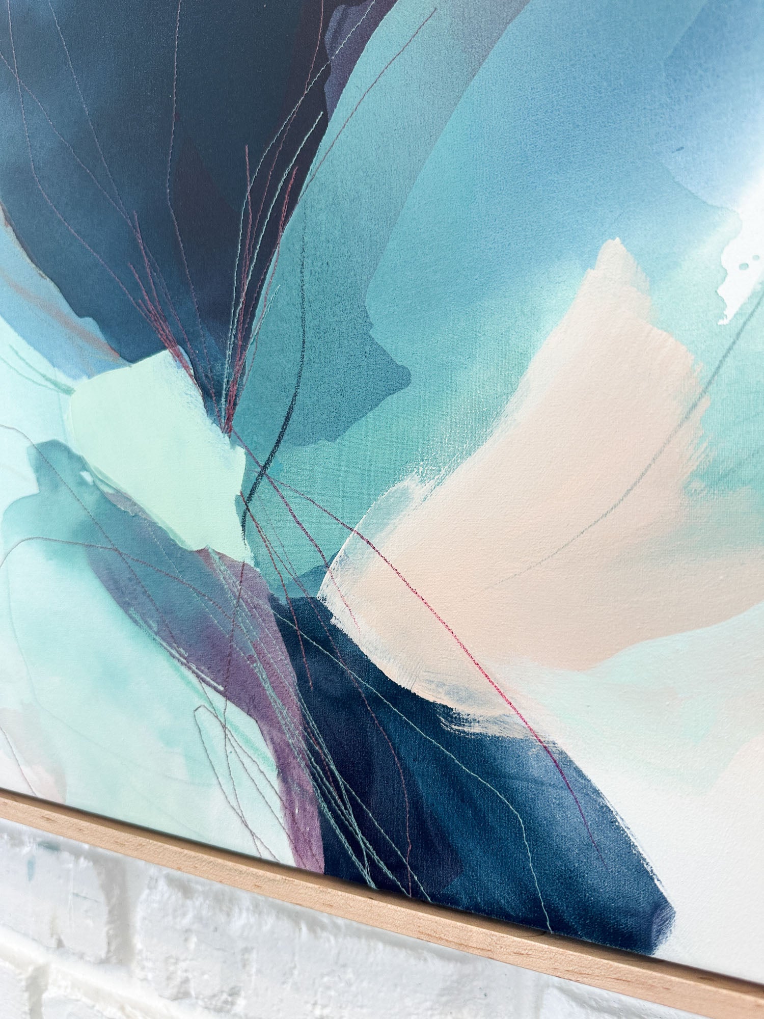 Deeann has a BFA from Memphis College of Art with a painting emphasis and has always been drawn to mixed media and collage. She took several fiber arts classes in college where she learned machine embroidery and sewing techniques. When she began working abstract a few years later, she combined these two techniques and found her own creative voice. She uses a sewing technique called free-motion machine embroidery on top of painted papers and incorporates those papers as collage.The stitched lines sit on top of fluid ink washes, colliding with bold paint scrapes and embellishing each piece with texture and delicate line, like veins running through the painting. “I am drawn to the tactility that the embroidery adds to the work both aesthetically and conceptually. The nature of thread is strong but intricate; it has a sort of permanence with the appearance of fragility.” Deeann has been in Nashville since 2018 and paints full time in her home studio with her two young daughters nearby.