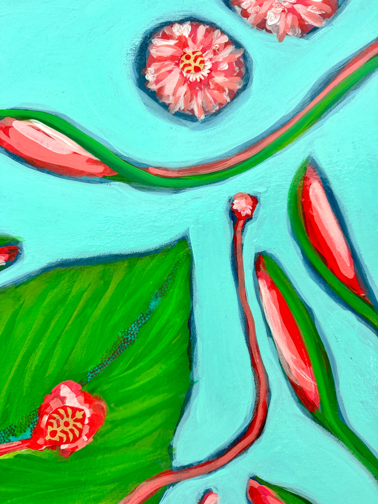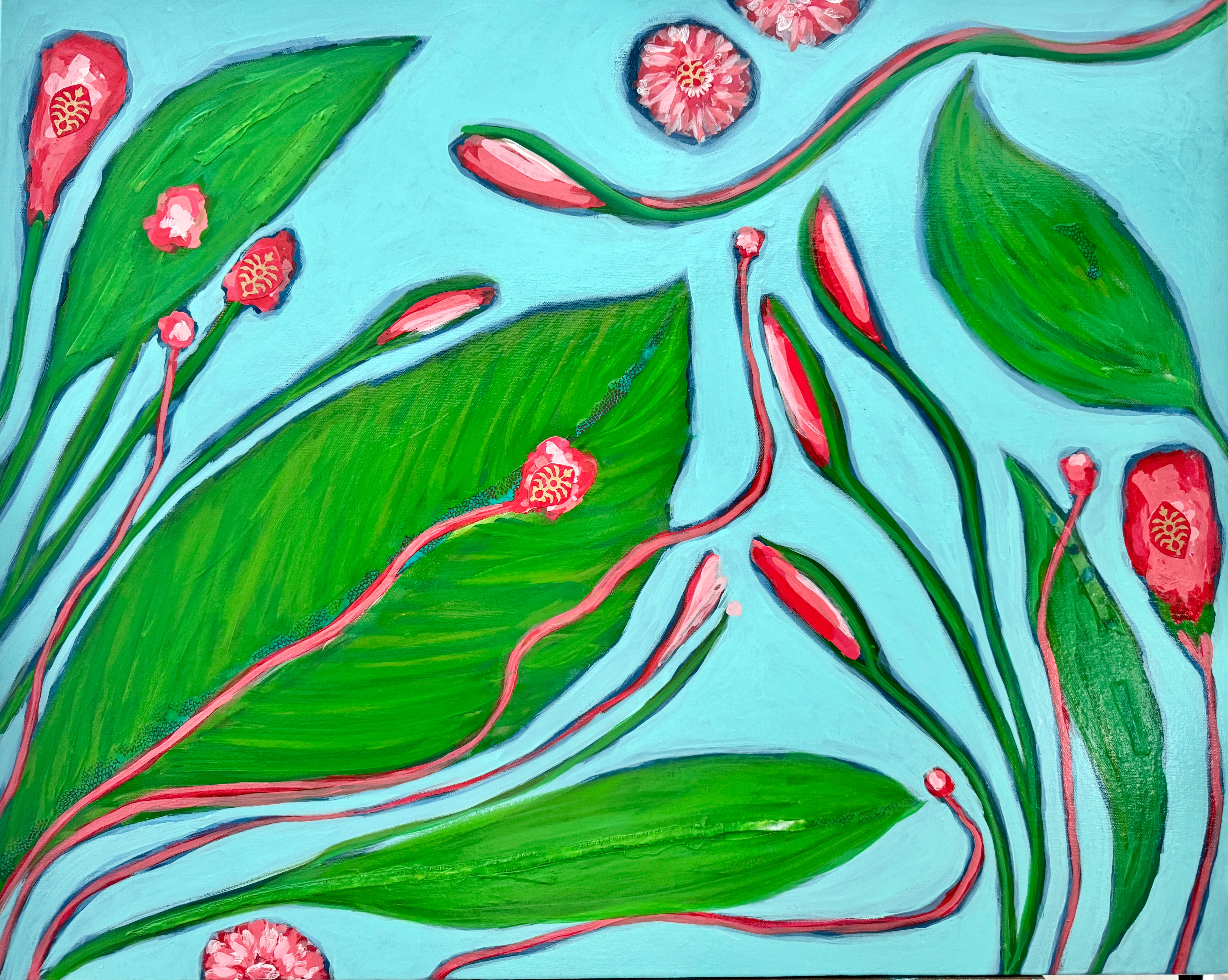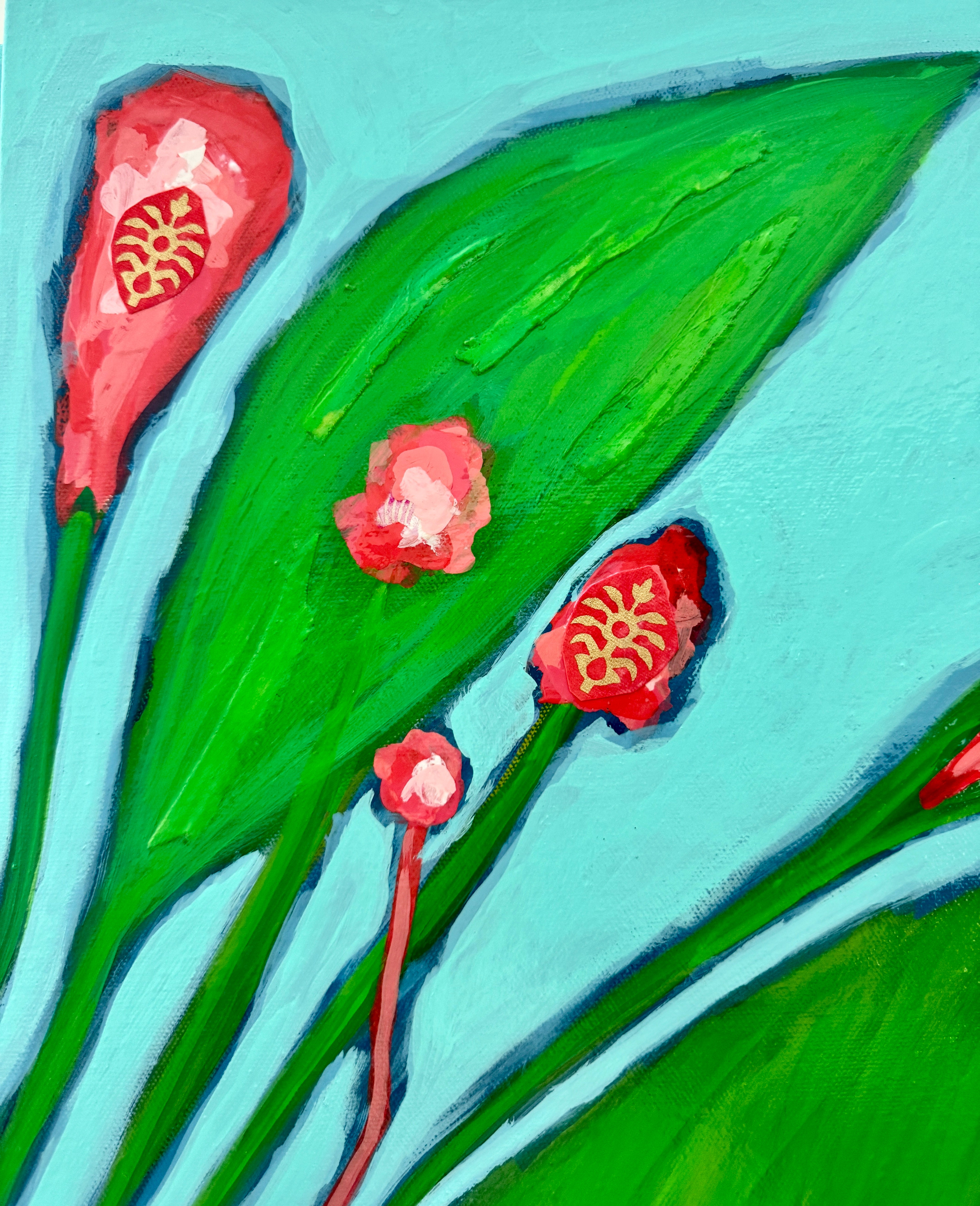 acrylic on canvas with paper collage pieces, gloss coat