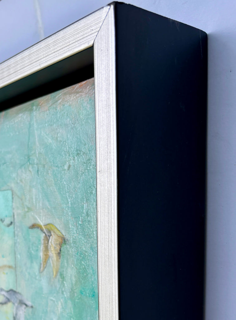 A lifelong artist, I make art because coming up with an idea is what gets me out of bed in the morning and into my studio, mercifully located in my home. So much of what I love in life is at home- my pets inside and wildlife out, nature pouring through the windows, comfortably cluttered rooms full of books and art, the forest surrounding me. My art originates with that early morning idea, a daily walk in the woods, the imagery around me. The deep connection to my surroundings is reflected in the art I make, even using pages of books in my art and the book itself as the canvas with the animals love as the subject. Animal and landscape renderings in mixed media, storytelling dioramas and large works on canvas all have a similar feel of natural wonder.
