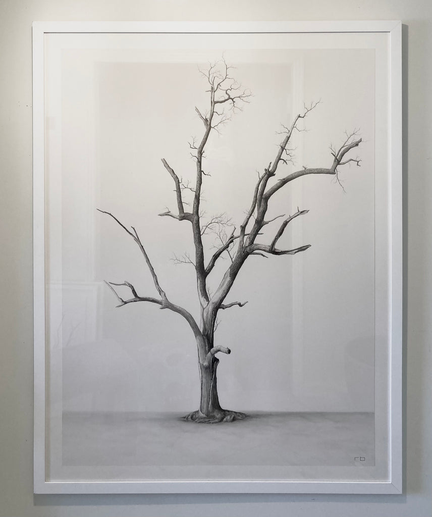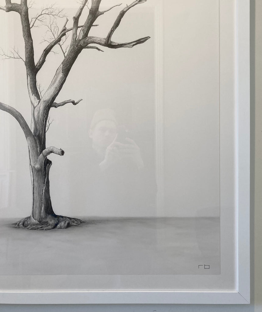 graphite on paper, floating on mat, in white frame
