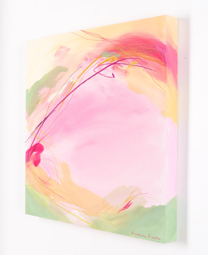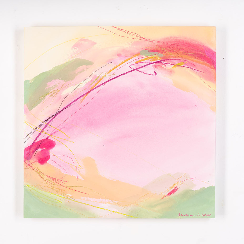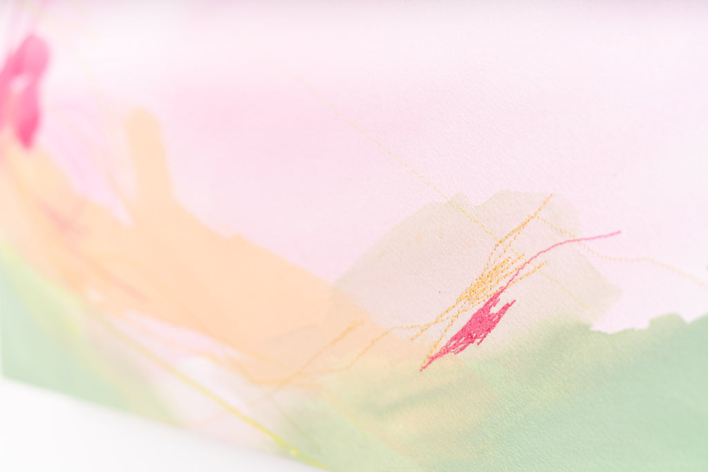 Deeann has a BFA from Memphis College of Art with a painting emphasis and has always been drawn to mixed media and collage. She took several fiber arts classes in college where she learned machine embroidery and sewing techniques. When she began working abstract a few years later, she combined these two techniques and found her own creative voice. She uses a sewing technique called free-motion machine embroidery on top of painted papers and incorporates those papers as collage.The stitched lines sit on top of fluid ink washes, colliding with bold paint scrapes and embellishing each piece with texture and delicate line, like veins running through the painting. “I am drawn to the tactility that the embroidery adds to the work both aesthetically and conceptually. The nature of thread is strong but intricate; it has a sort of permanence with the appearance of fragility.” Deeann has been in Nashville since 2018 and paints full time in her home studio with her two young daughters nearby.