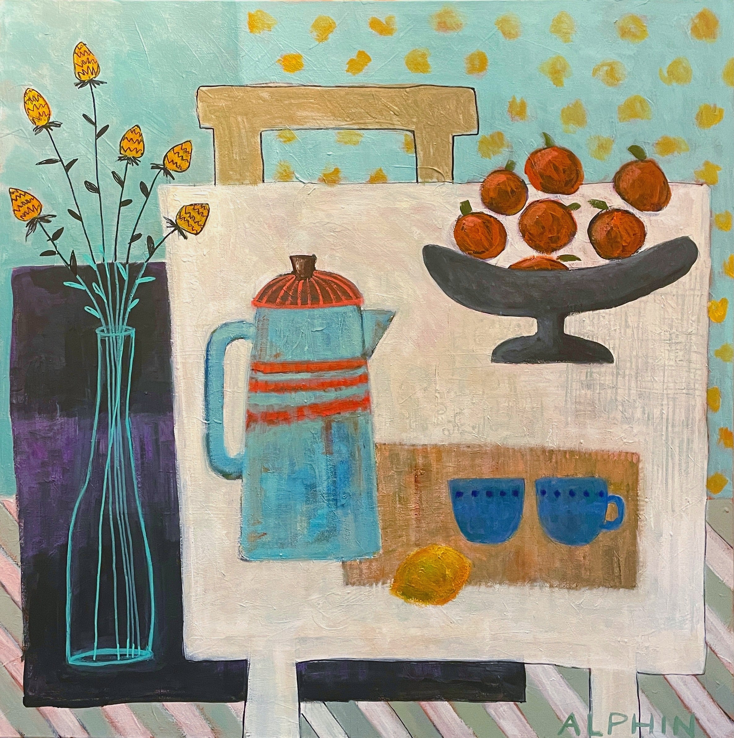 Debby Alphin grew up in Charlotte and graduated from the University of North Carolina at Chapel Hill, working first in advertising and later in software design. In 2003 after raising a family, she decided to pursue a second degree in architecture and began taking drawing and painting classes in order to create an entrance portfolio. The art won out and she began painting full time. She works in both oils and acrylics and describes her abstracts as a way to create order out of chaos. She has been fortunate to study with Elizabeth Ross, Andy Braitman, Nancy Franke, Jeanette LeGrue, David Shevlino, Gary Weiss and Gary Bodner. The California abstract artist, Nicholas Wilton, has been an incredible teacher and mentor. Artist Statement: “While architecture, geometry, symbols, and anything black and white have always inspired me, they are becoming much more apparent in my art. I like a certain amount of structure as I feel it grounds my work. From there I intuitively reference my own vocabulary of icons, both real and invented to create a narrative. I gravitate to straight lines, graphic shapes, lost edges and unique mark making to create a visual story which in the end I hope is as entertaining and appealing to the viewer as it is me, the artist. The joy is in the process.”