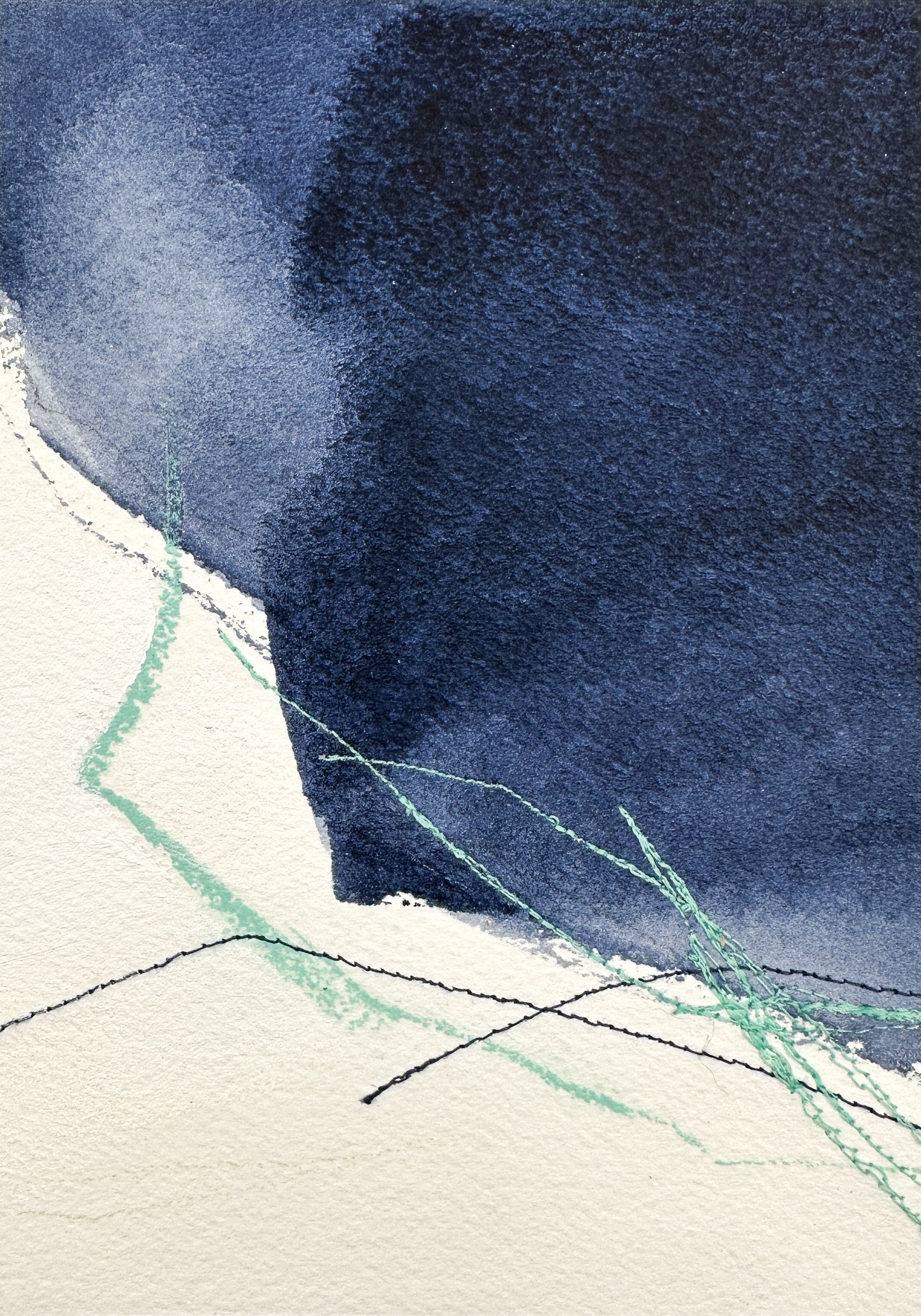Deeann has a BFA from Memphis College of Art with a painting emphasis and has always been drawn to mixed media and collage. She took several fiber arts classes in college where she learned machine embroidery and sewing techniques. When she began working abstract a few years later, she combined these two techniques and found her own creative voice. She uses a sewing technique called free-motion machine embroidery on top of painted papers and incorporates those papers as collage.The stitched lines sit on top of fluid ink washes, colliding with bold paint scrapes and embellishing each piece with texture and delicate line, like veins running through the painting. “I am drawn to the tactility that the embroidery adds to the work both aesthetically and conceptually. The nature of thread is strong but intricate; it has a sort of permanence with the appearance of fragility.” Deeann has been in Nashville since 2018 and paints full time in her home studio with her two young daughters nearby.