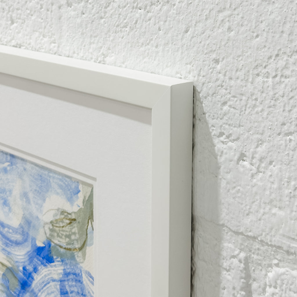 mixed media on Arches paper, in double white mat and white frame