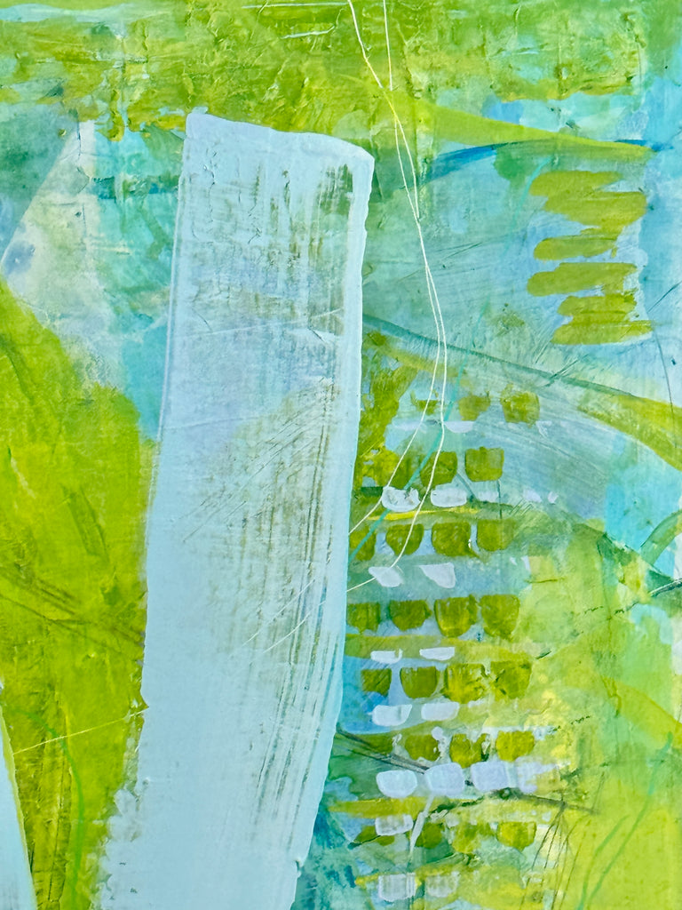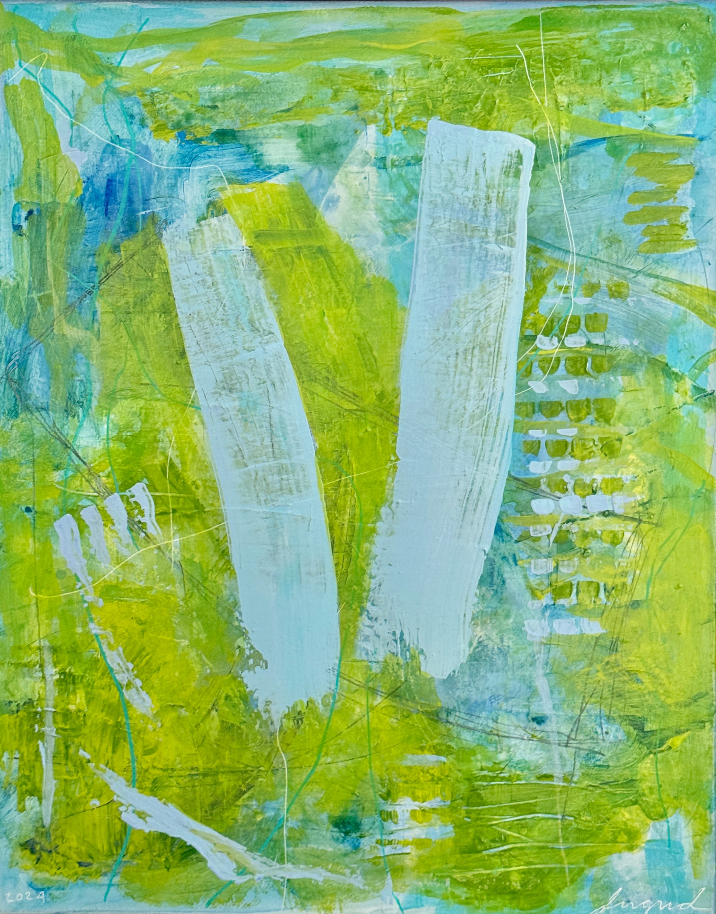 acrylic, paint pens and graphite on canvas, in wood floater frame