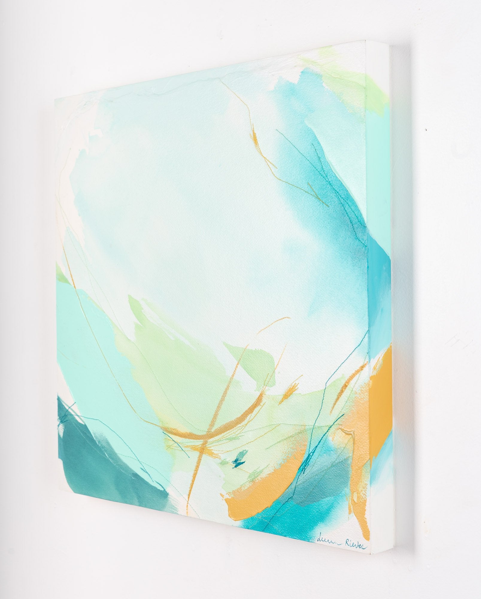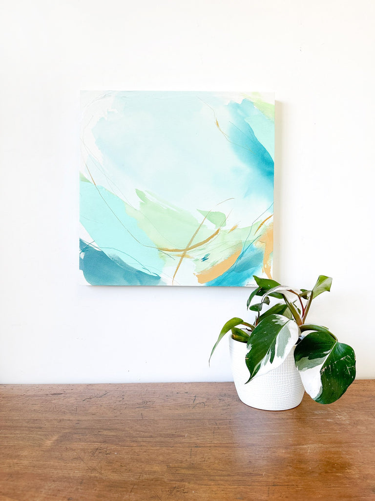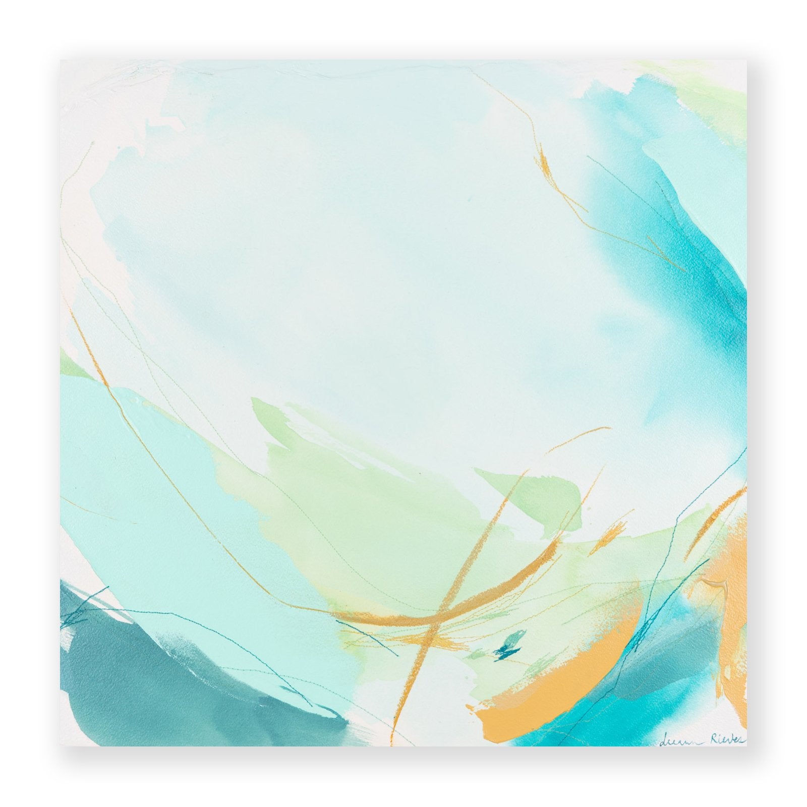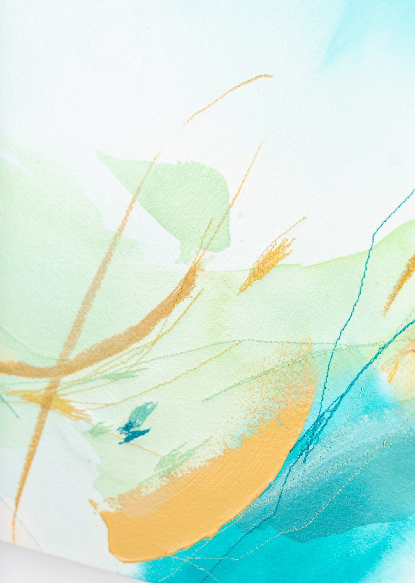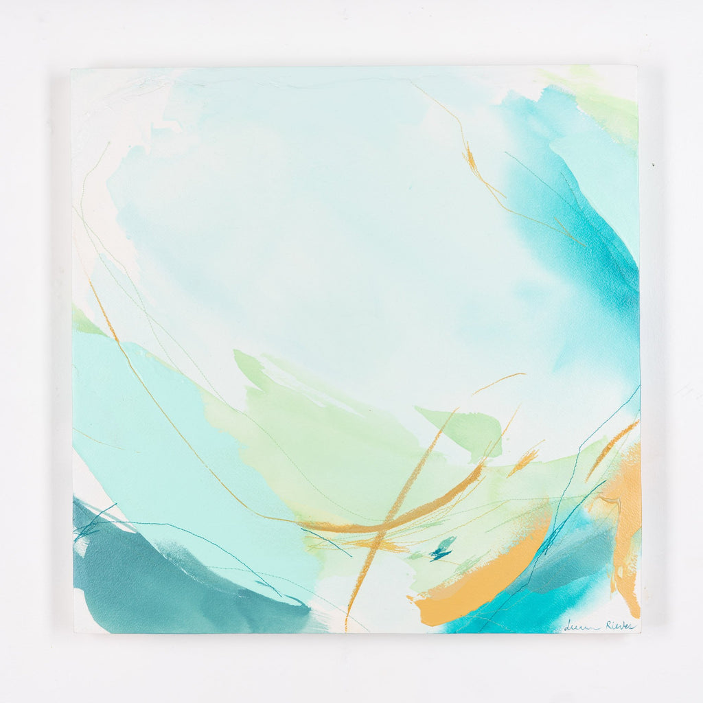 Deeann has a BFA from Memphis College of Art with a painting emphasis and has always been drawn to mixed media and collage. She took several fiber arts classes in college where she learned machine embroidery and sewing techniques. When she began working abstract a few years later, she combined these two techniques and found her own creative voice. She uses a sewing technique called free-motion machine embroidery on top of painted papers and incorporates those papers as collage.The stitched lines sit on top of fluid ink washes, colliding with bold paint scrapes and embellishing each piece with texture and delicate line, like veins running through the painting. “I am drawn to the tactility that the embroidery adds to the work both aesthetically and conceptually. The nature of thread is strong but intricate; it has a sort of permanence with the appearance of fragility.” Deeann has been in Nashville since 2018 and paints full time in her home studio with her two young daughters nearby.