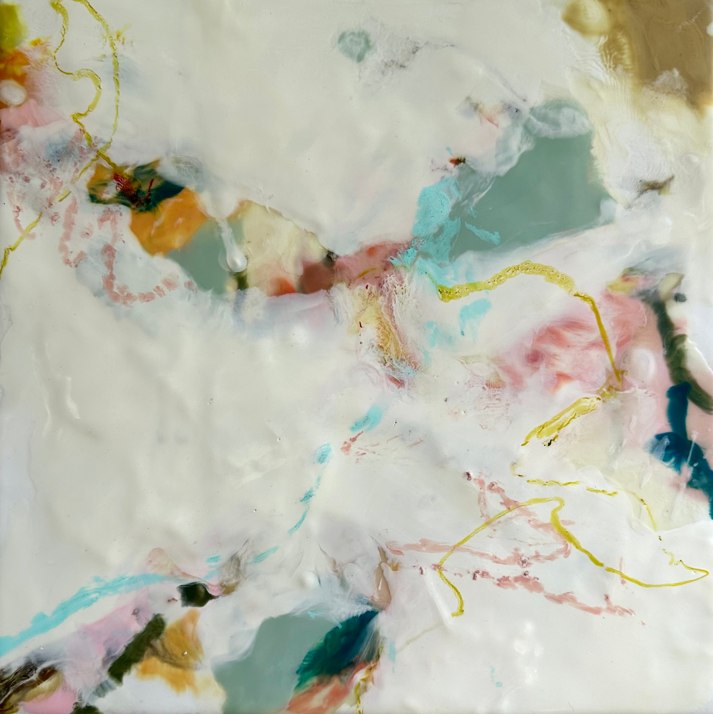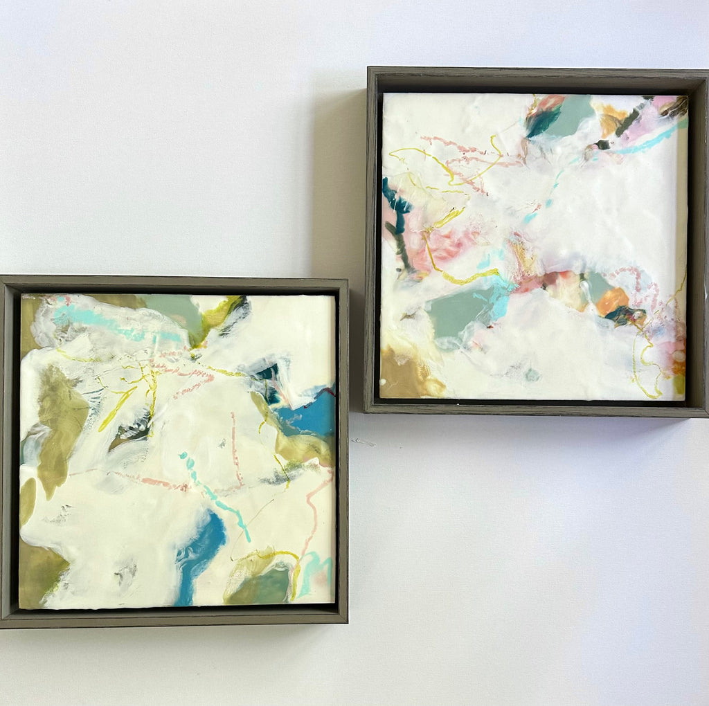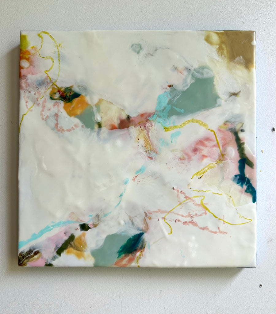 encaustic on wood, in blue-green wood floating frame