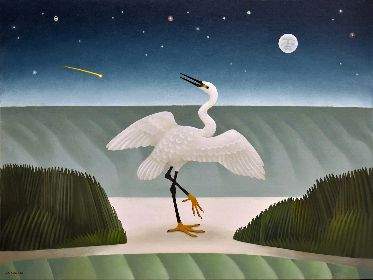 Wilfred Spoon is a painter working in the SC Lowcountry. Born in Charlotte, NC in 1960 he earned his MFA at Parsons School of design in New York in 1987. His chosen media is oil painting. His paintings explore traditional landscapes, still lifes, as well as interiors. His still lifes and interiors search the mystery of the everyday while maintaining an emphasis on structure. His landscapes are a celebration of nature and fantasy. Sometimes dark but always optimistic. He strives to express what the artist knows rather than what he sees, and so the facts of physical reality are largely sifted through the mind and personality of the painter. His paintings demonstrate his love for the naive as well as his art education. This combination infuses his work with a surprising clarity in an unexpected world.