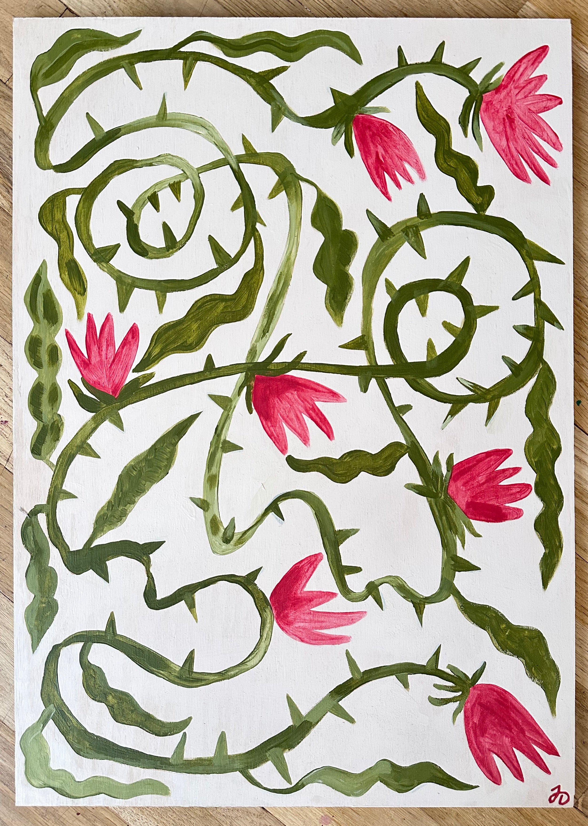 Tess Davies is an artist from Nashville, TN. She graduated cum laude from Sewanee: The University of the South with a B.F.A under the honors program in 2014. Her studio practices include murals, acrylic and oil painting, with a focus on natural textures, layered spaces and dualities. She takes inspiration from escapism and natural and biological textures and forms. "My work explores dualities. It restructures familiar, natural objects into a composition of disparate parts. It combines intricate details found in natural textures, fluidity, and chaos. Stillness and movement, color and contrast, and structure and looseness are all prevalent dualities in my work. The purpose of my practice is to address various inevitabilities in life. I am inspired by escapism and utilize this coping mechanism in my work. I use natural symbolism and feminine tropes, seen in the color palette and various natural forms. Common themes include decay, disease, growth, genetics, femininity, and repetition. I draw on personal issues and anxieties that bring people together, while simultaneously causing divides. I address what separates and connects us, and the cyclical nature of life and human tendencies. The painted, abstract beings represent our tendencies to compartmentalize and reveal personal anxieties. They transition in and out of abstractions and natural forms. This movement between the real and the imagined is representational of escapism. Creating these patterns, and repeating them intricately and deliberately, directly correlates to our repeated tendencies. It is also representative of the constant division of cells and growth found in the processes of decay and rebirth. By using natural metaphors, the purpose of this work is to beautify the inevitable."