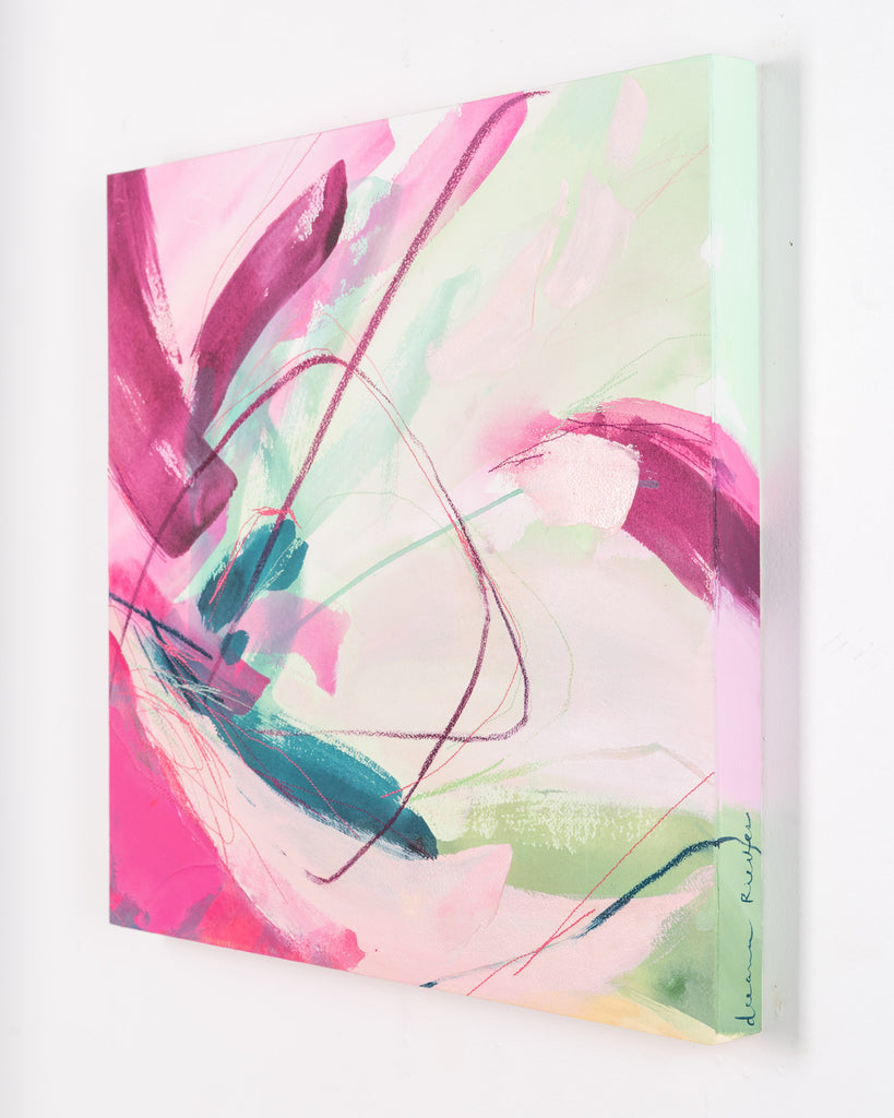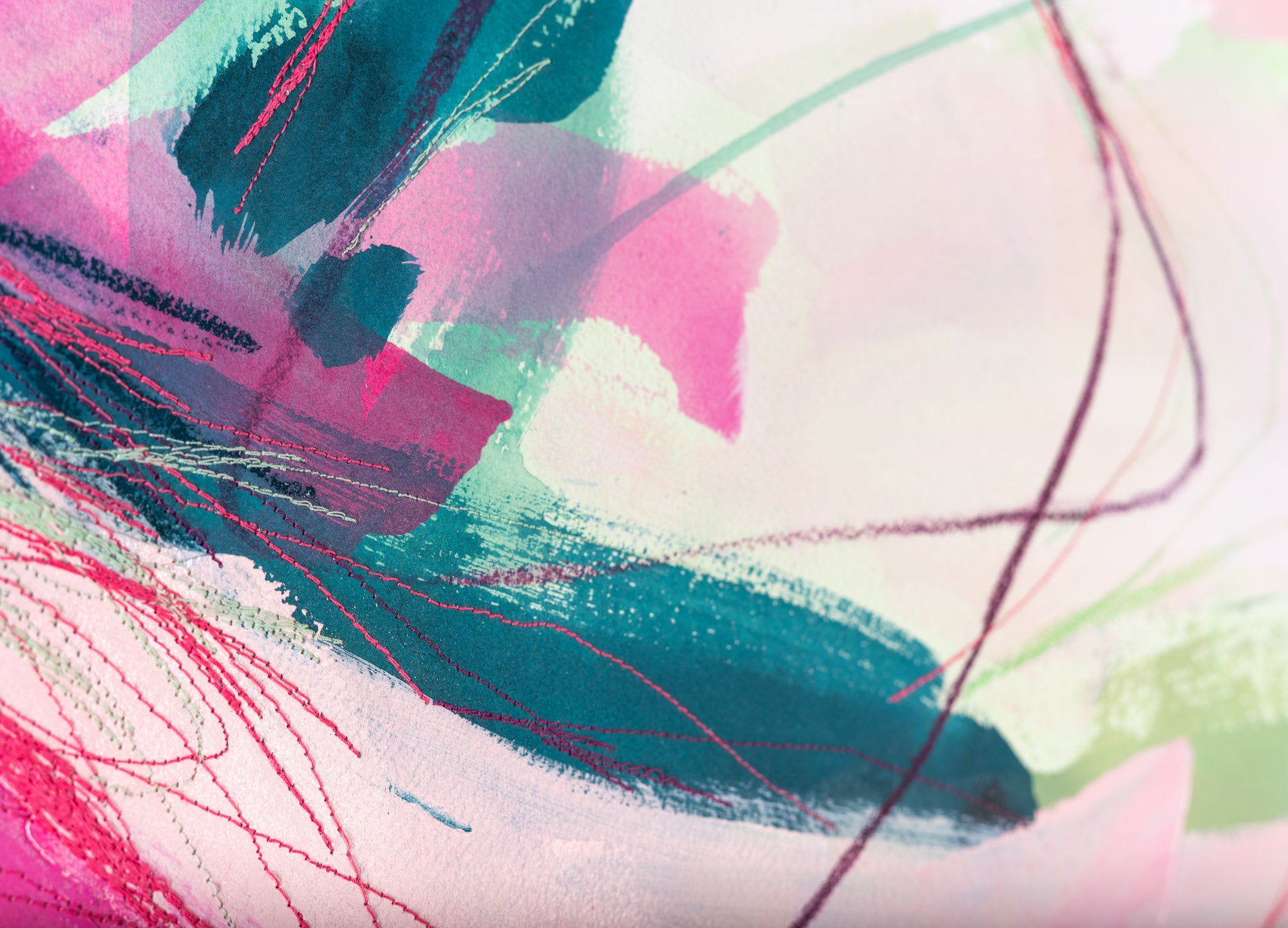 Deeann has a BFA from Memphis College of Art with a painting emphasis and has always been drawn to mixed media and collage. She took several fiber arts classes in college where she learned machine embroidery and sewing techniques. When she began working abstract a few years later, she combined these two techniques and found her own creative voice. She uses a sewing technique called free-motion machine embroidery on top of painted papers and incorporates those papers as collage.The stitched lines sit on top of fluid ink washes, colliding with bold paint scrapes and embellishing each piece with texture and delicate line, like veins running through the painting. “I am drawn to the tactility that the embroidery adds to the work both aesthetically and conceptually. The nature of thread is strong but intricate; it has a sort of permanence with the appearance of fragility.” Deeann has been in Nashville since 2018 and paints full time in her home studio with her two young daughters nearby.