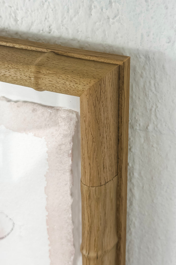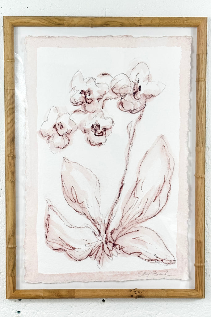 watercolor stick on handmade paper, float mounted on white mat, in faux bamboo wood frame