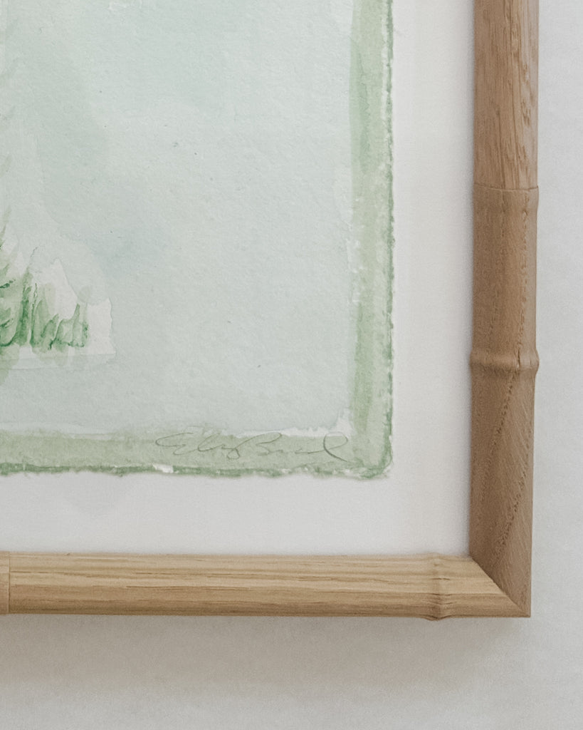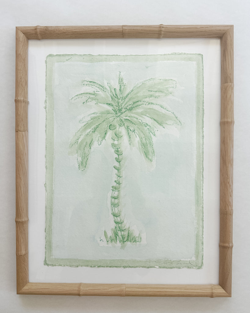 mixed media on handmade paper, float mounted on white mat in natural wood faux bamboo frame