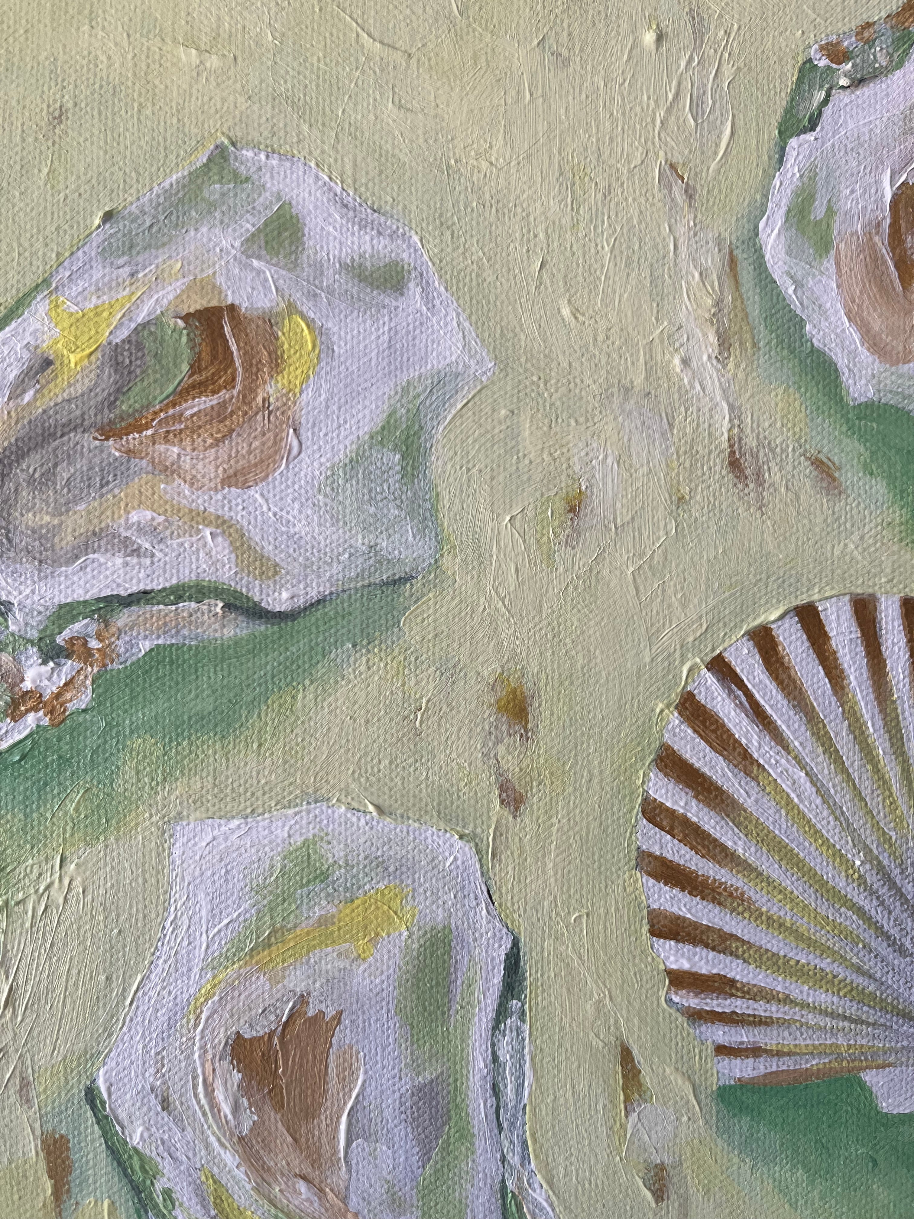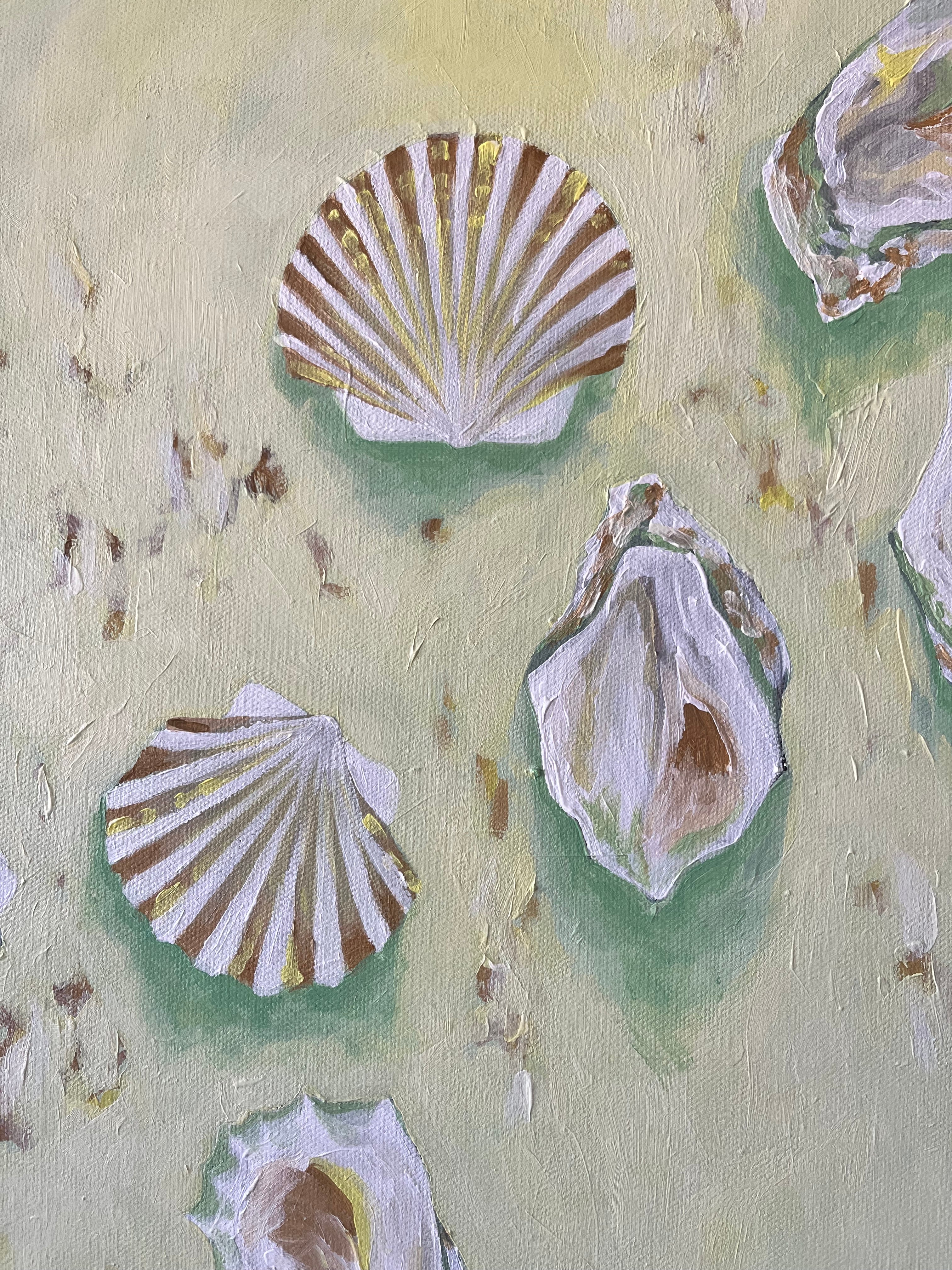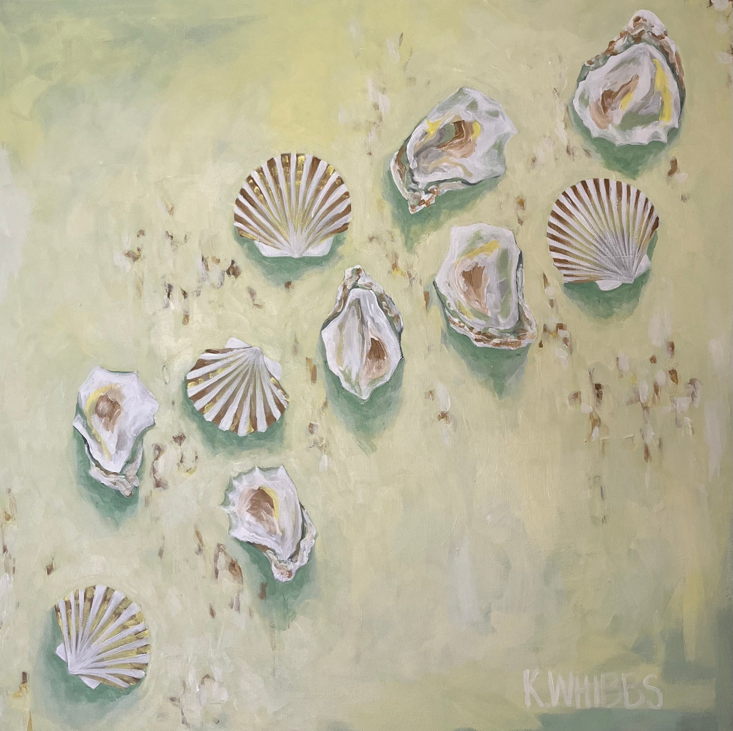 Pensacola based artist, Kelly Whibbs, finds her inspiration right at home on the Gulf Coast. The vibrant beauty and serene energy of her coastal town is infused into her work through layers of color and texture. Most of Kelly’s works are acrylic on canvas and feature organic forms one might find near the sea. She is probably most well known for her paintings of palms, which are featured in many of her collectors’ homes and businesses. Her most recent works are influenced by her seashell collection from a lifetime of beachcombing on Pensacola Beach and Maryland’s Eastern Shore. Kelly enjoys experimenting with scale and light, inviting the viewer to step forward and take a closer look. When she is not painting, Kelly can be found spending time with her husband, their three little boys, and their dog, Chessy. They are on the water whenever possible- whether boating, catching crabs, fishing, or just having themselves a beach day.