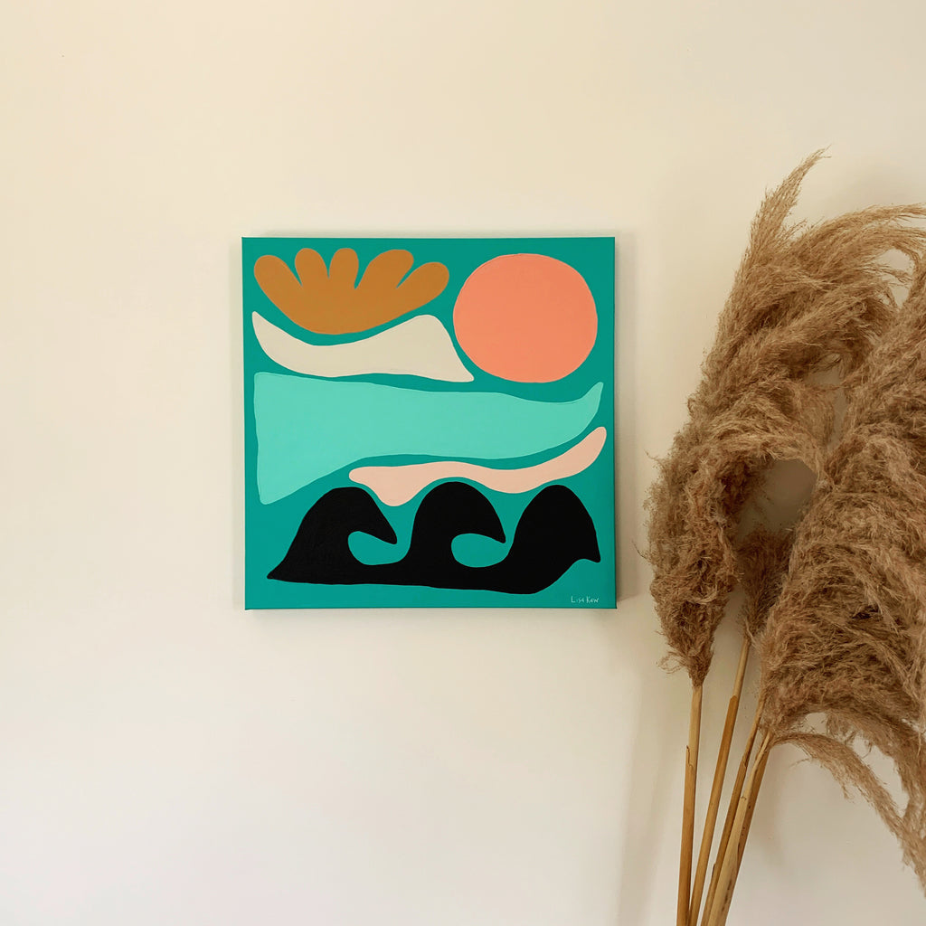 Totally tropical Lisa Kaw shares her love for nature and travel through her vibrant paintings. From her South Florida jungalow, she uses acrylic on canvas to transform the beauty around her into tangible one of a kind treasures. A minimalist at heart, Lisa thrives best when surrounded only by the blues and greens of the natural world and the curious melody of the rainforest chatter. Bali and the Big Island of Hawaii are her most sacred visited places. With a playful palette and a joyful spirit, Lisa Kaw creates work that simply and purely communicates the wonder of our natural world.