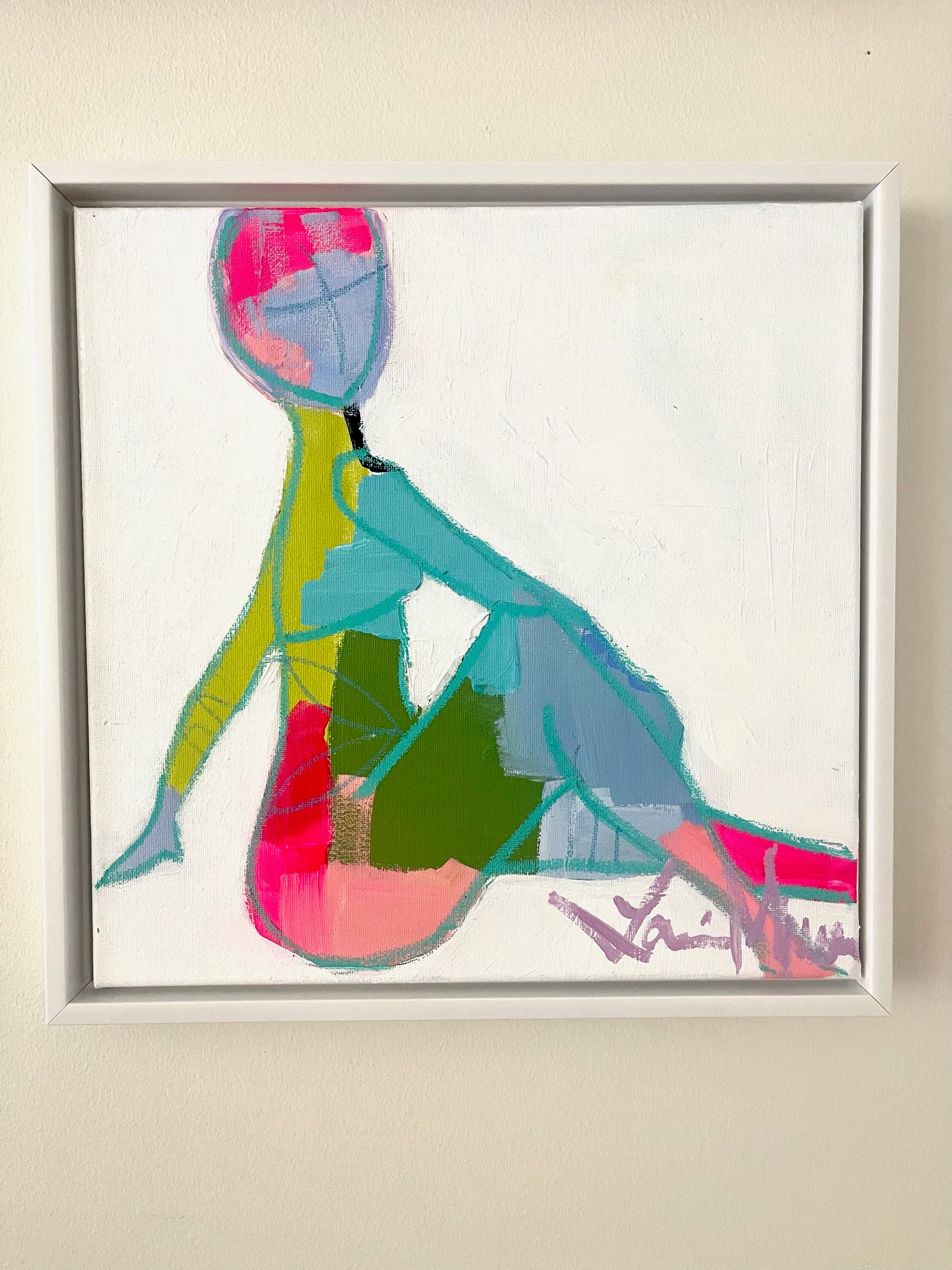 acrylic and oil pastel on canvas, in white floater frame