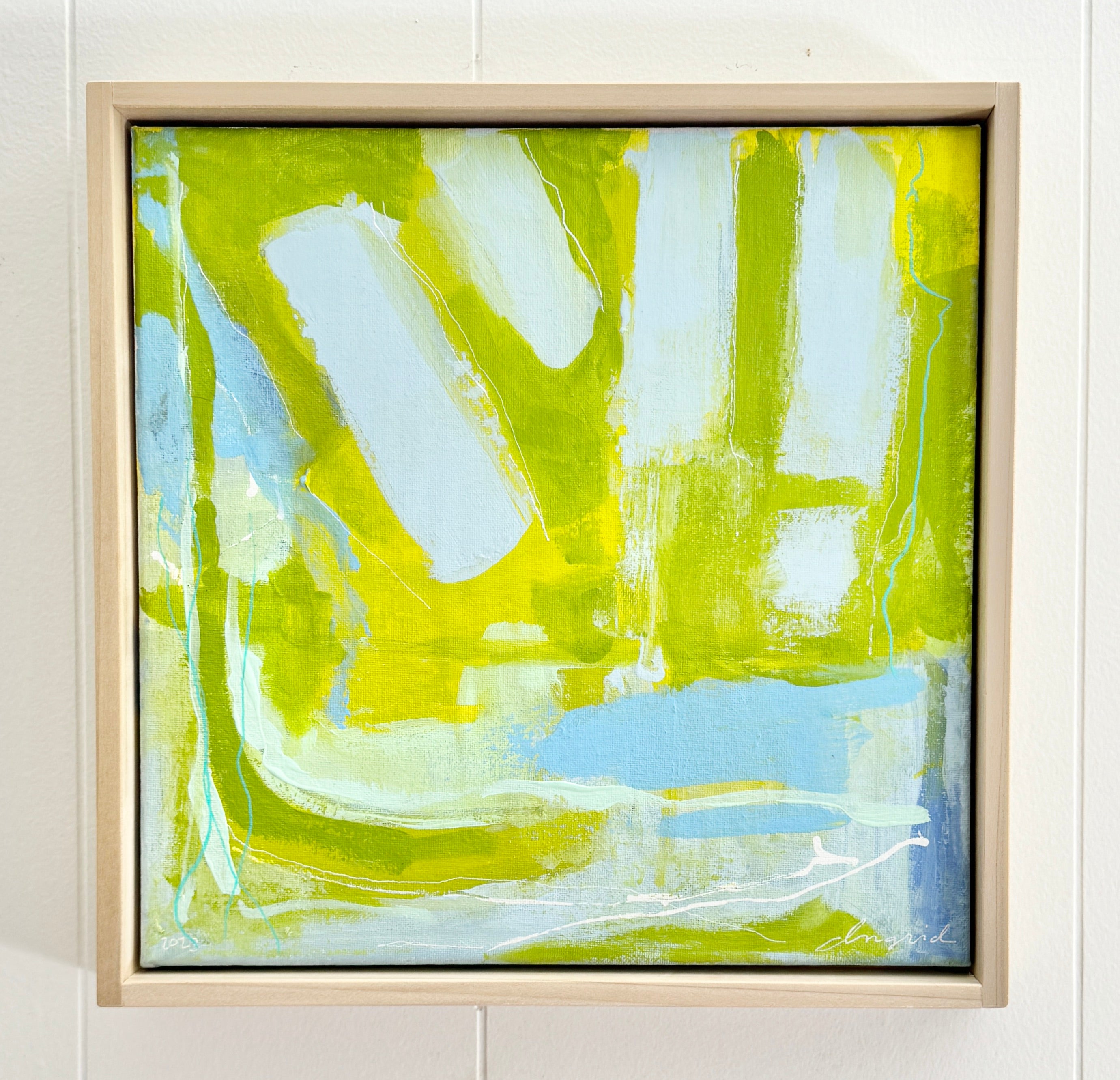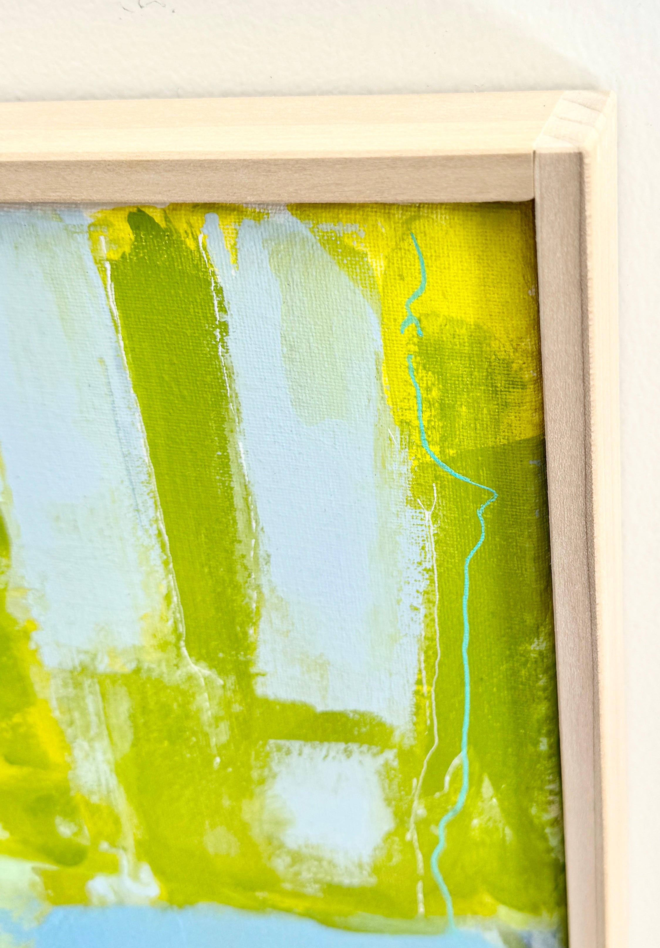 acrylic and paint pen on canvas, in natural wood floater frame