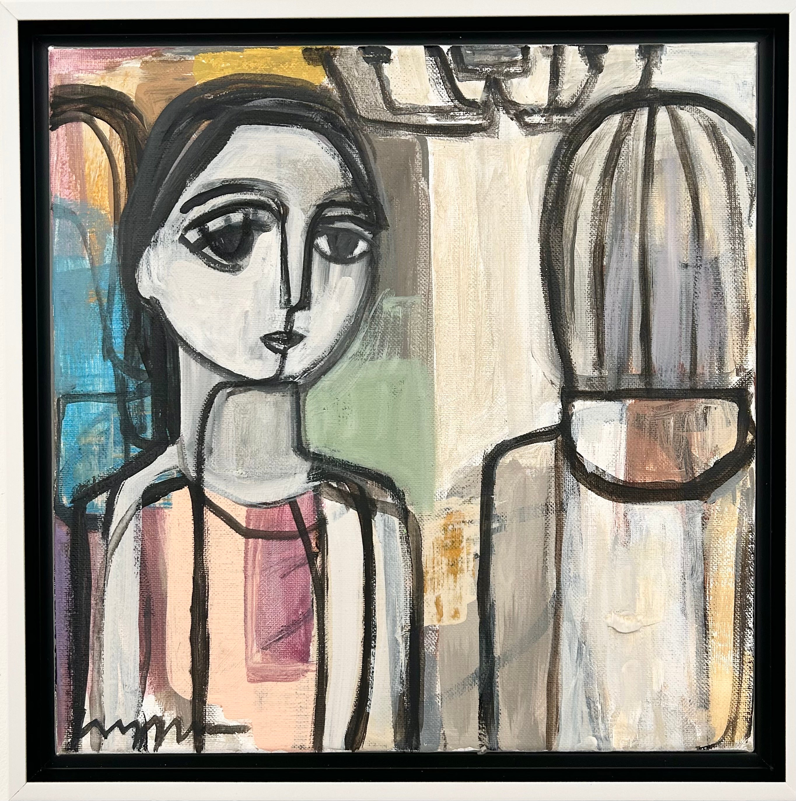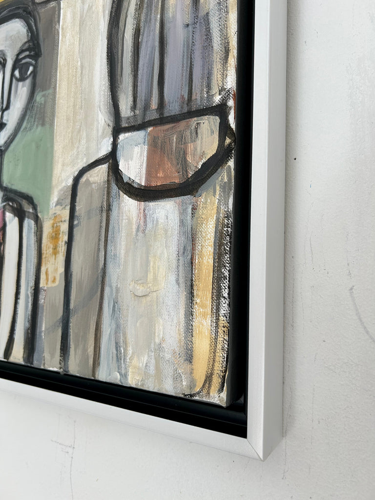 acrylic on canvas, in white and black floater frame